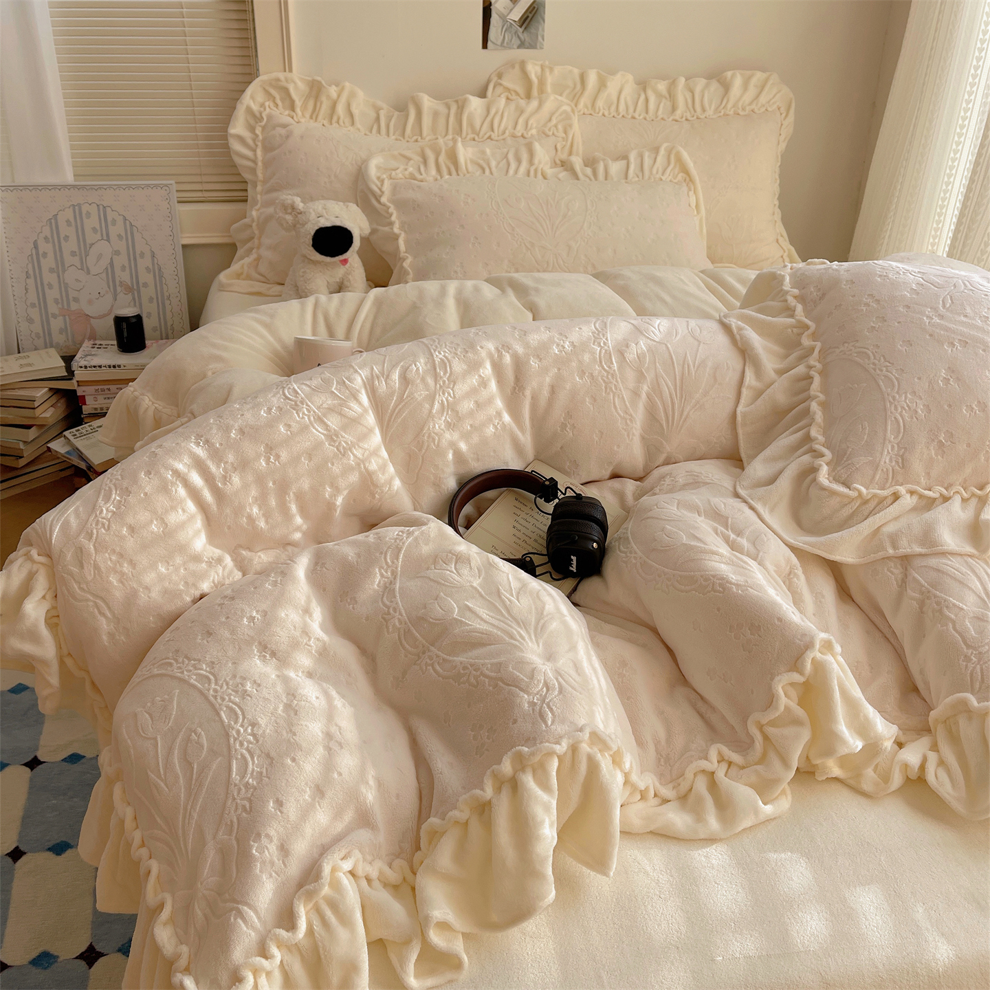 法式公主风四件套牛奶绒花边被套罩加厚保暖冬季床上用品床单笠三