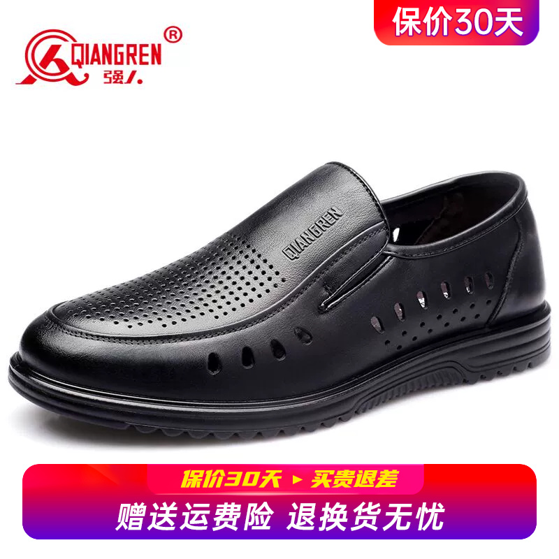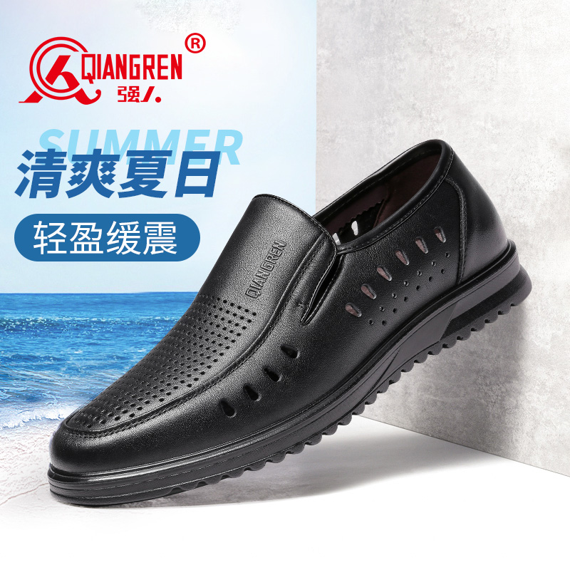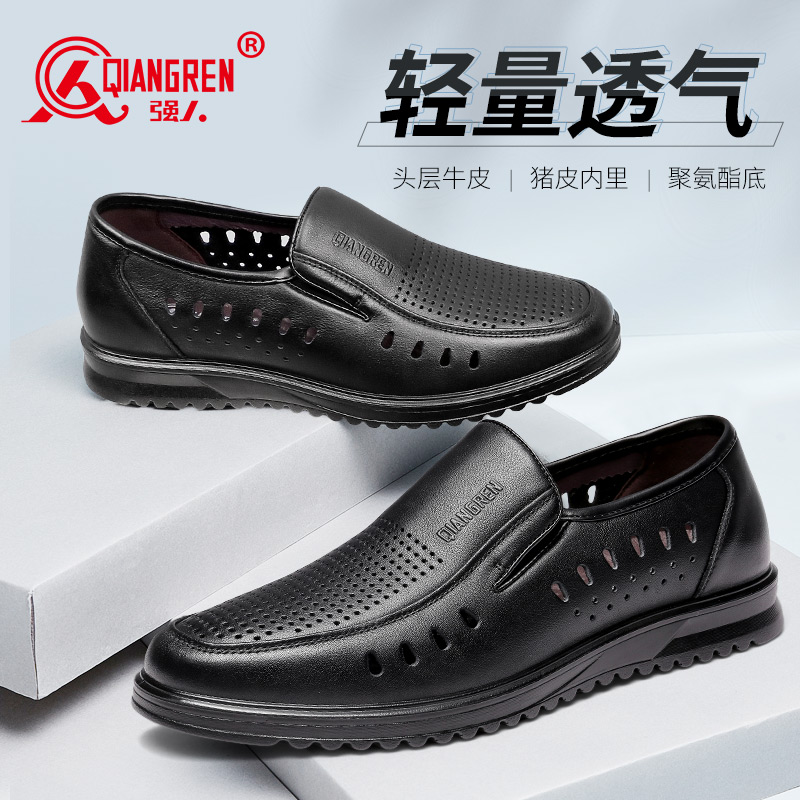 强人3515皮鞋男夏季一脚蹬透气镂空真皮中老年父亲皮鞋软底爸爸鞋