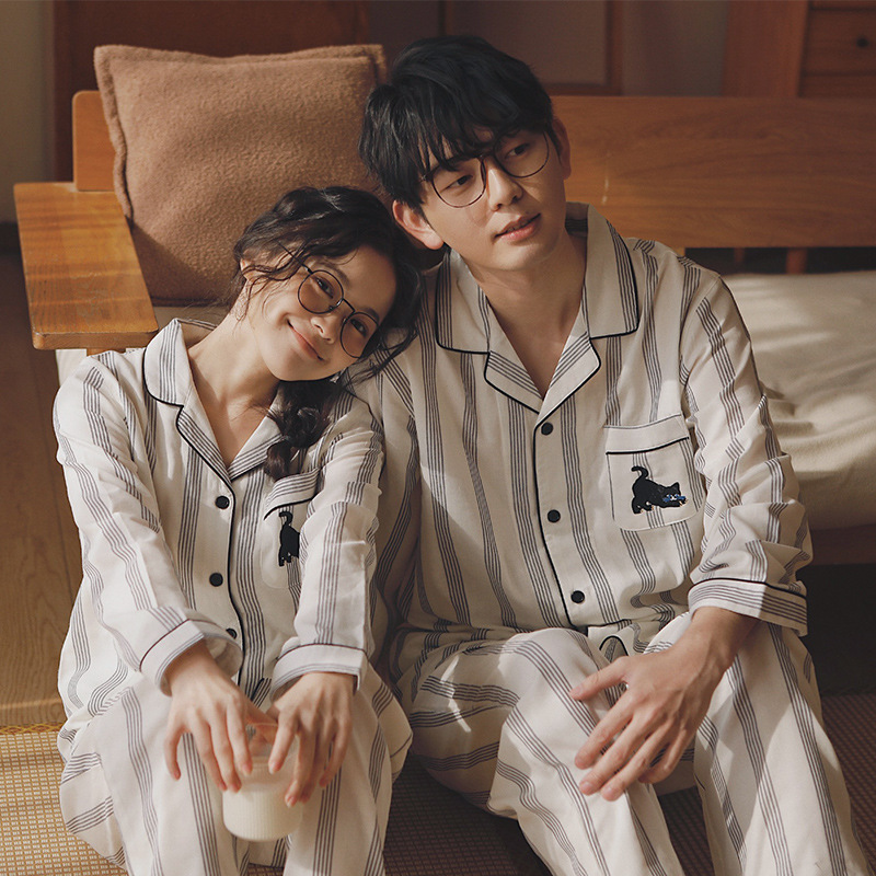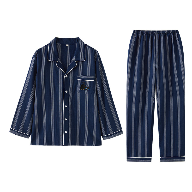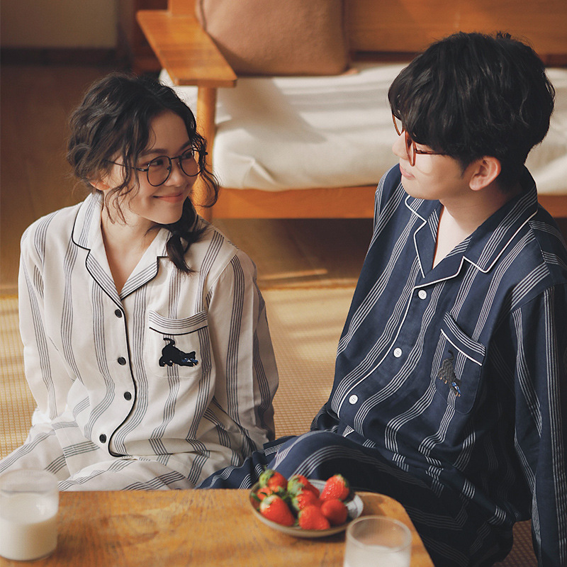 无印日式睡衣男女士春夏秋条纹纯棉双层纱布长袖家居服情侣套装薄