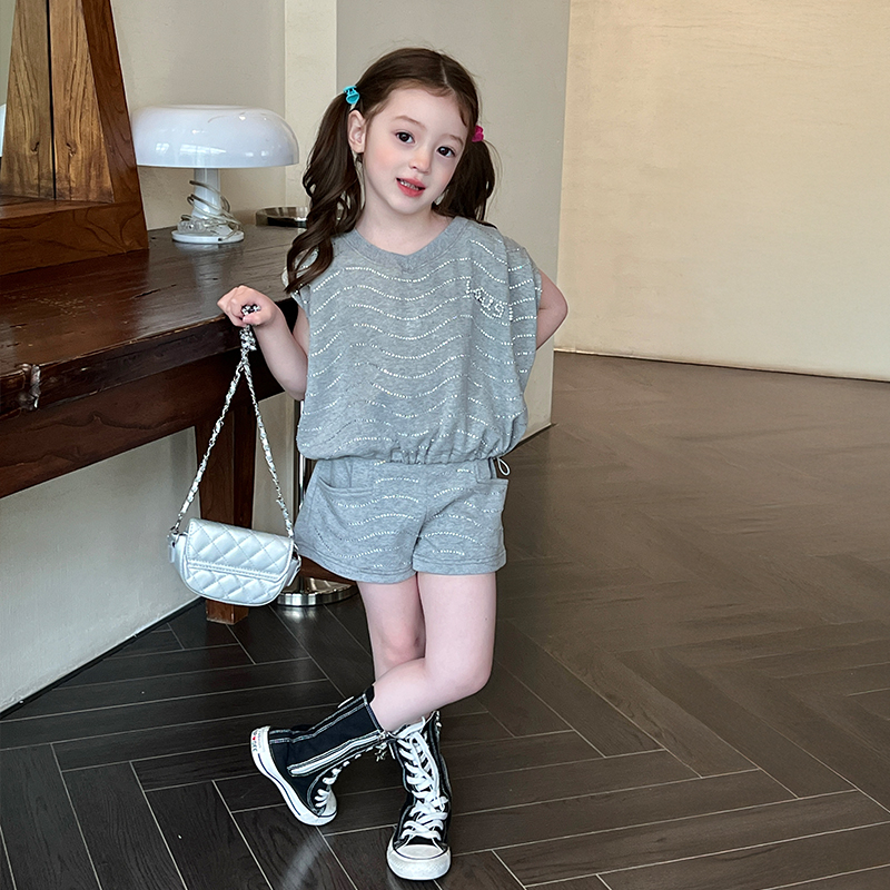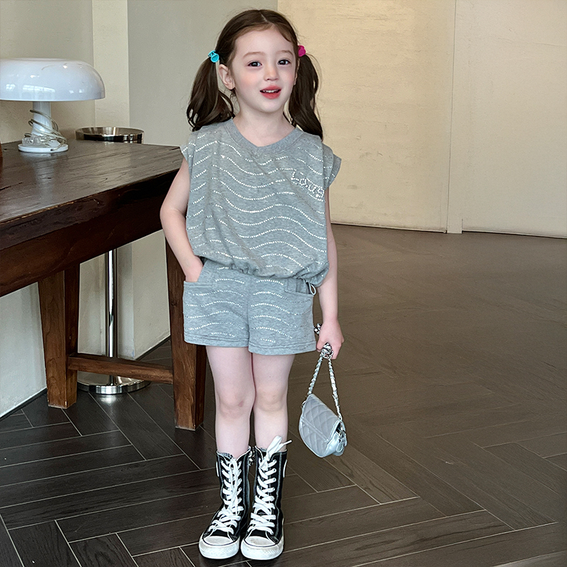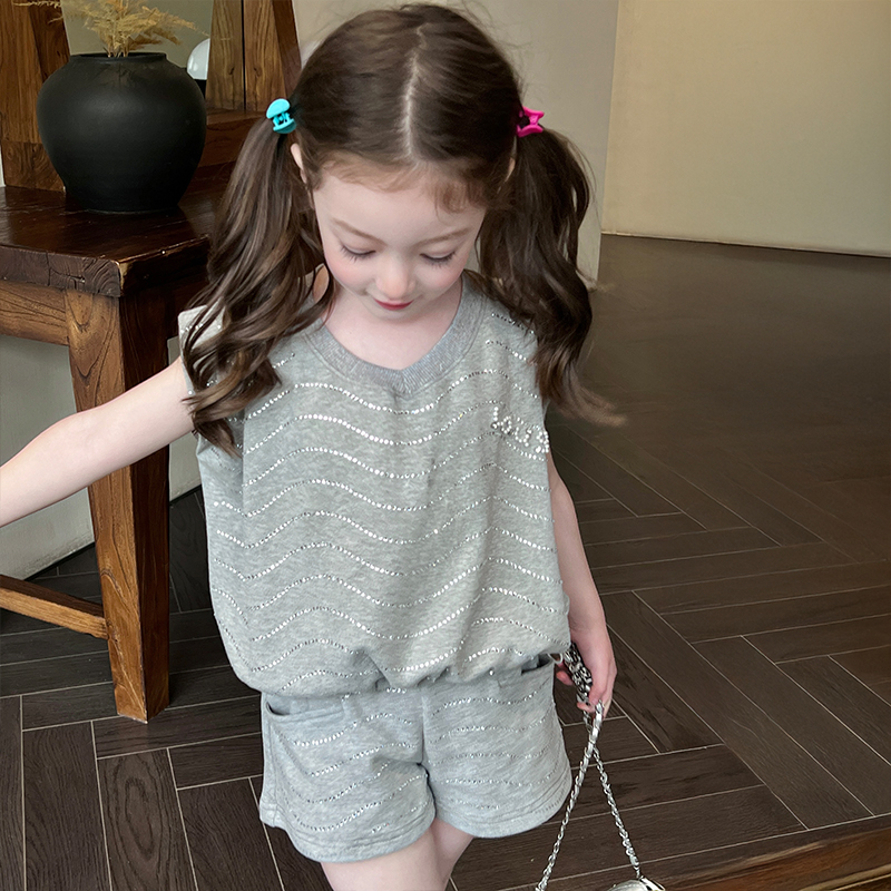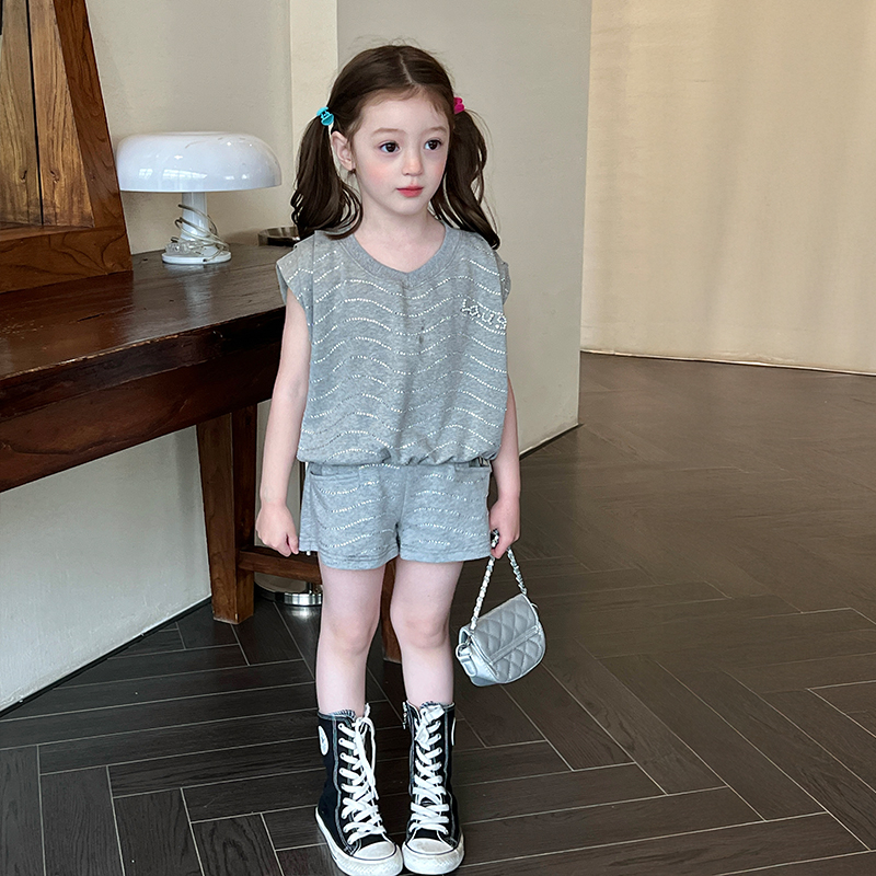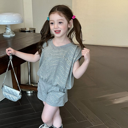 栀了成长记童装女童韩版时髦烫钻休闲套装夏季儿童V领短裤两件套