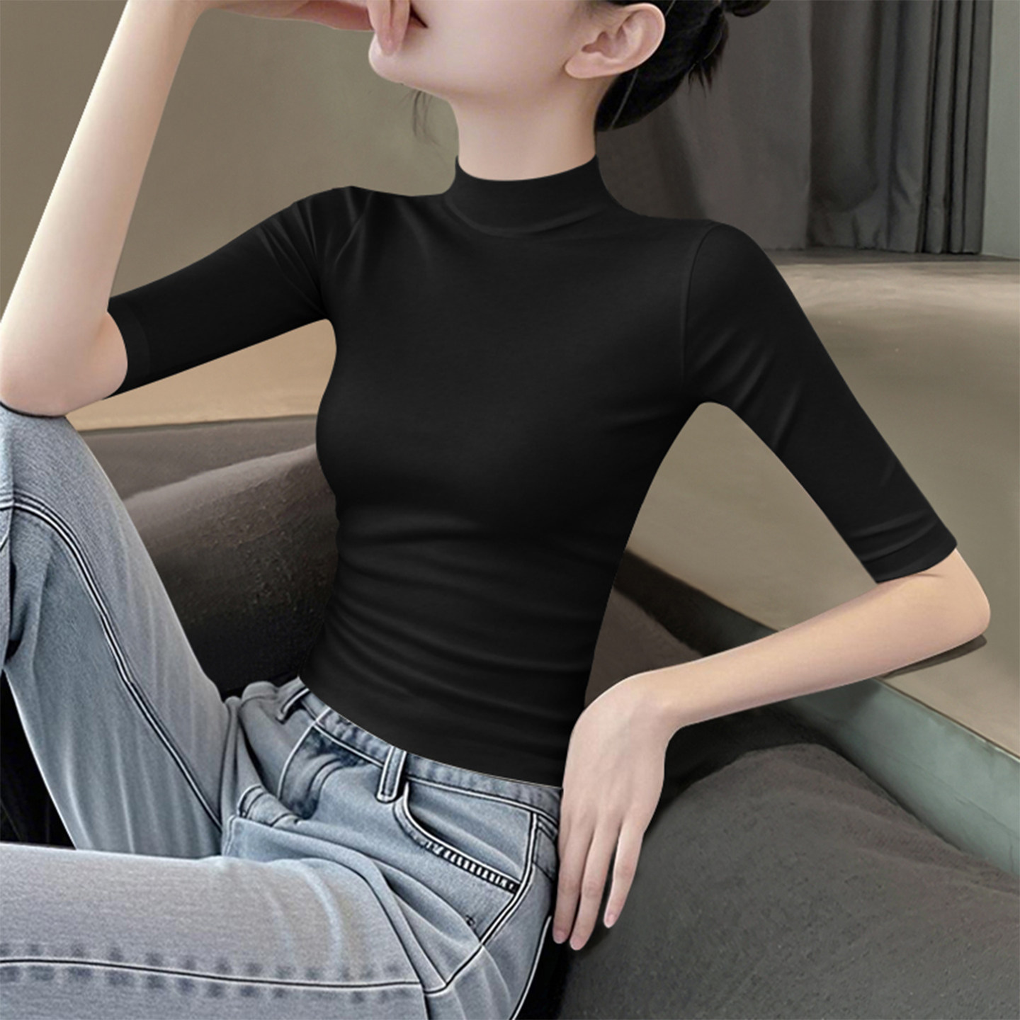 白色半高领中袖T恤女2025新款早秋打底修身显瘦百搭紧身内搭上衣