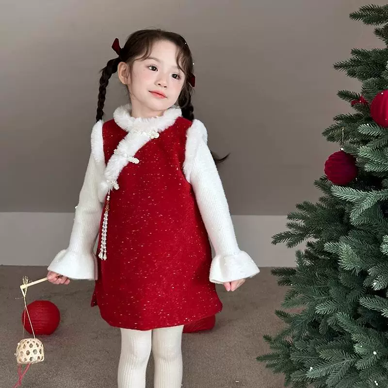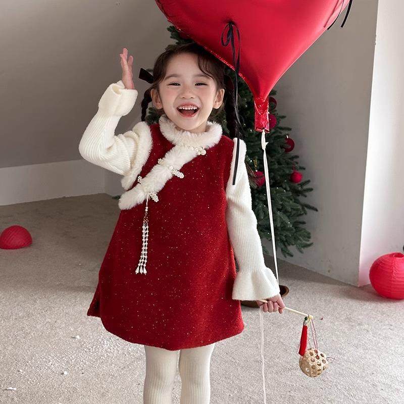 新年女童加绒公主裙2025秋冬新款女宝宝旗袍国风连衣裙红色拜年服