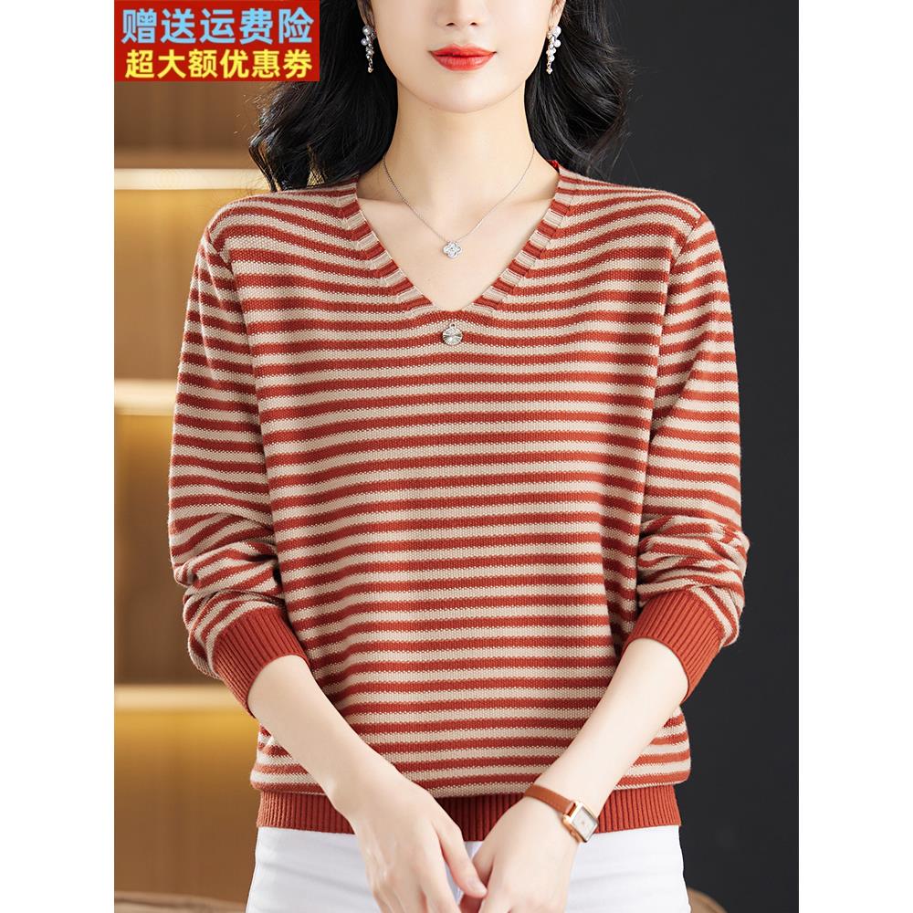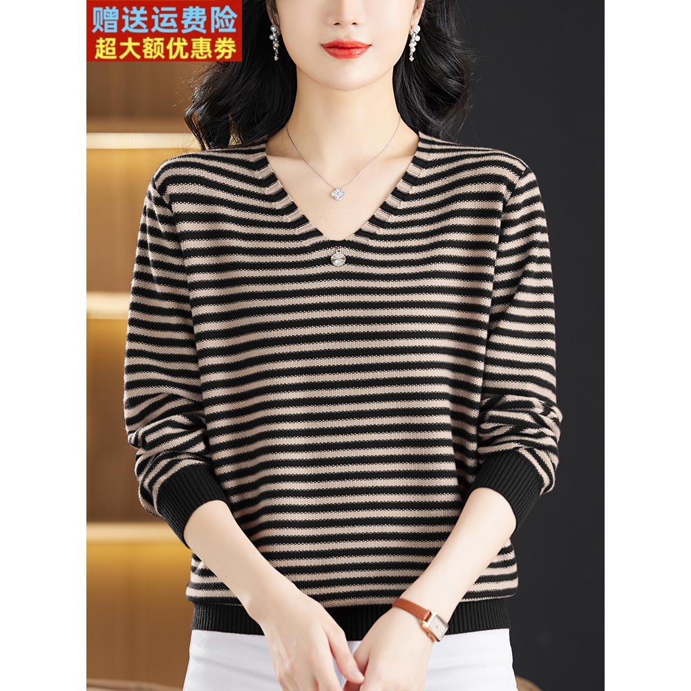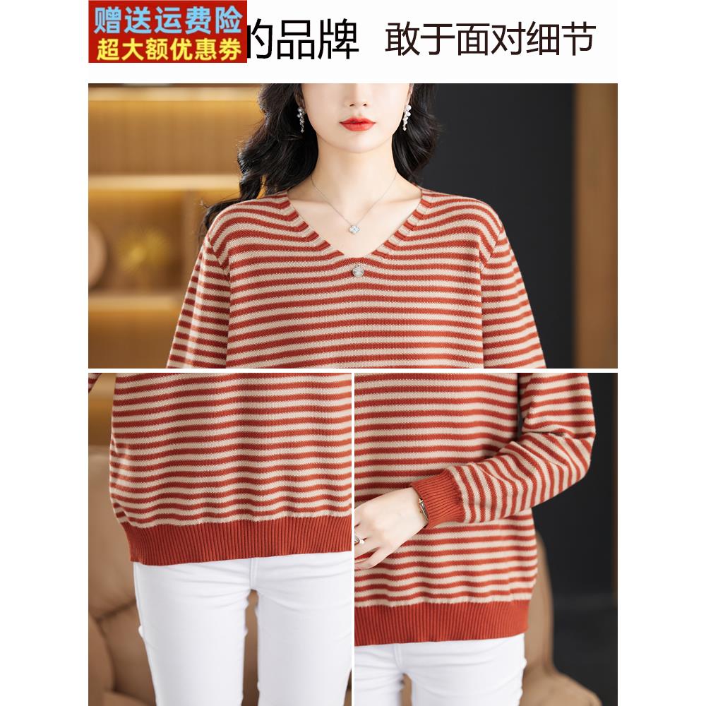 特大码春秋新款v领条纹毛衣女宽松羊毛打底衫胖妈妈薄款针织上衣