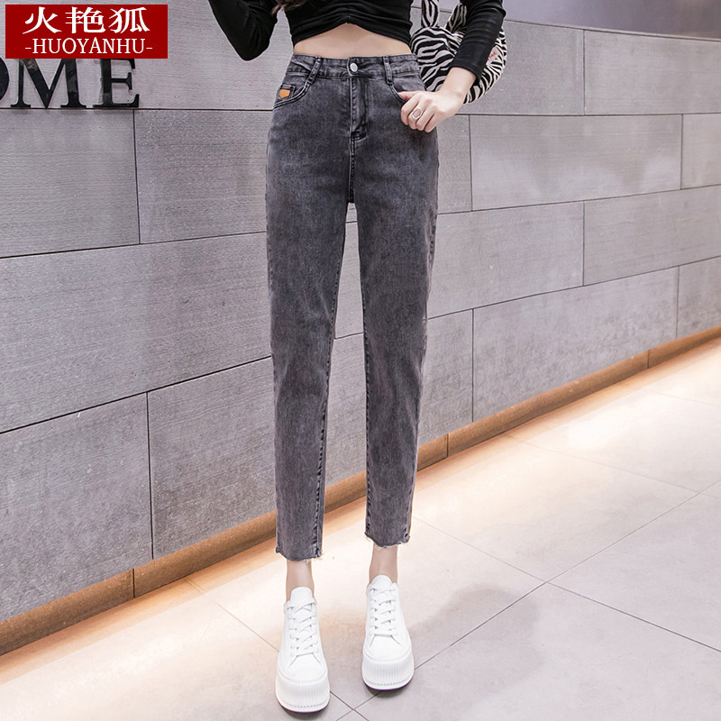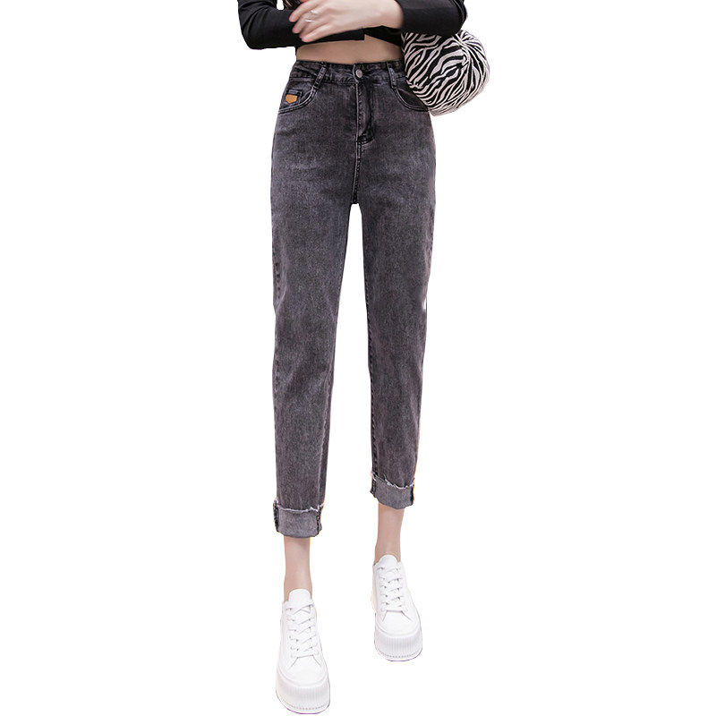 烟灰色牛仔裤女弹力高腰宽松修身显瘦哈伦直筒毛边老爹九分休闲裤