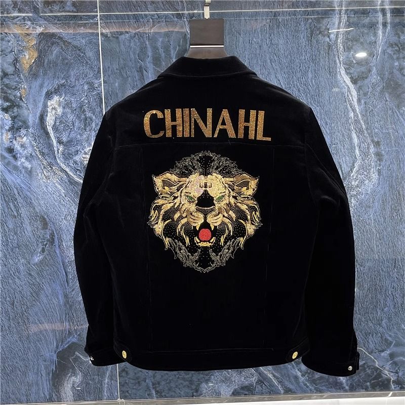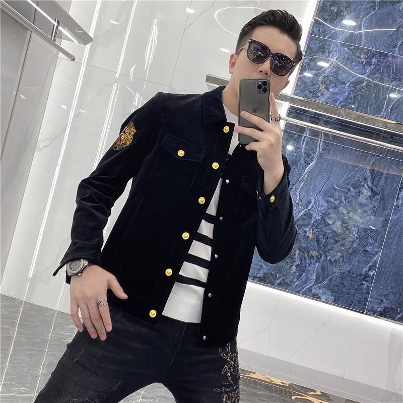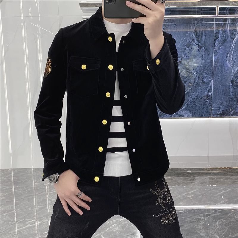 秋冬季加绒保暖灯芯绒夹克男士潮牌修身高端时尚印花翻领上衣外套