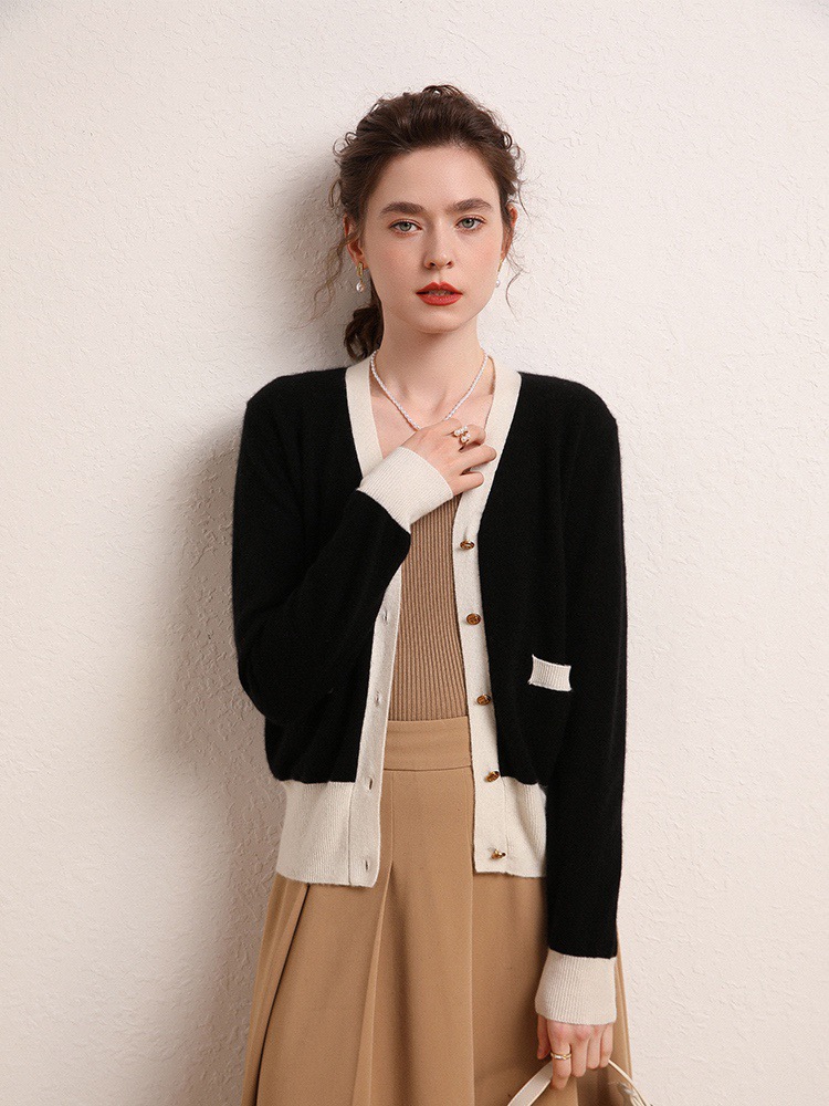 秋冬新款小香风V领羊绒开衫女山羊绒撞色边金口针织外套短款毛衣