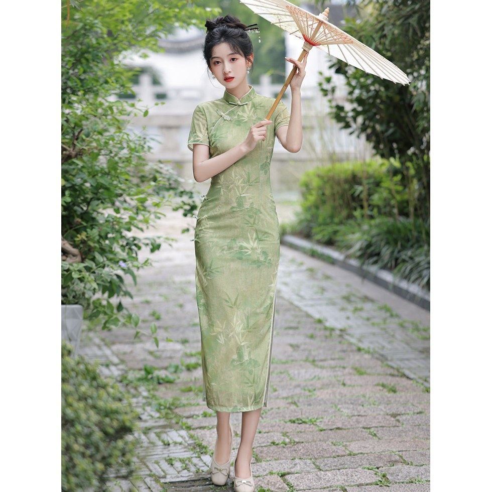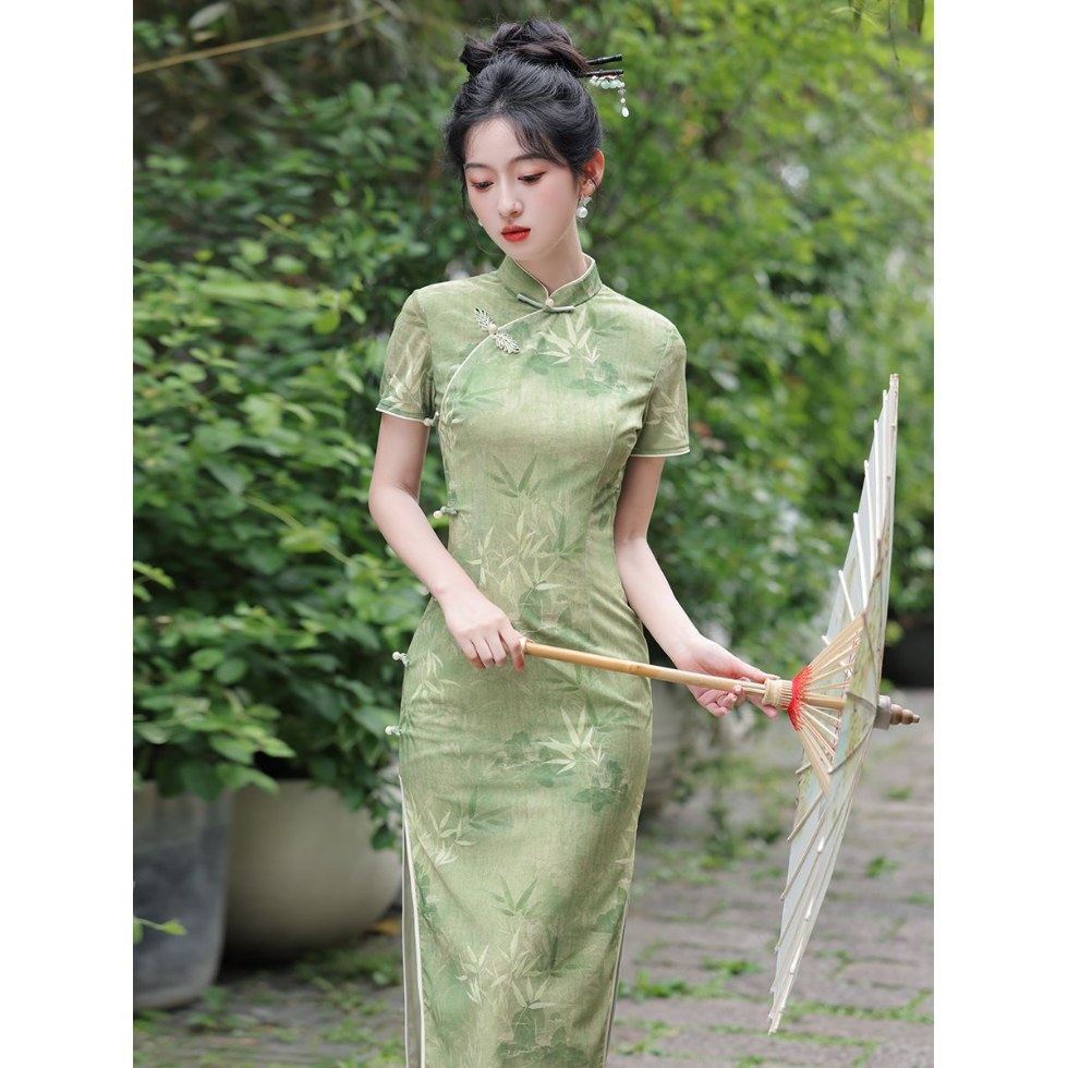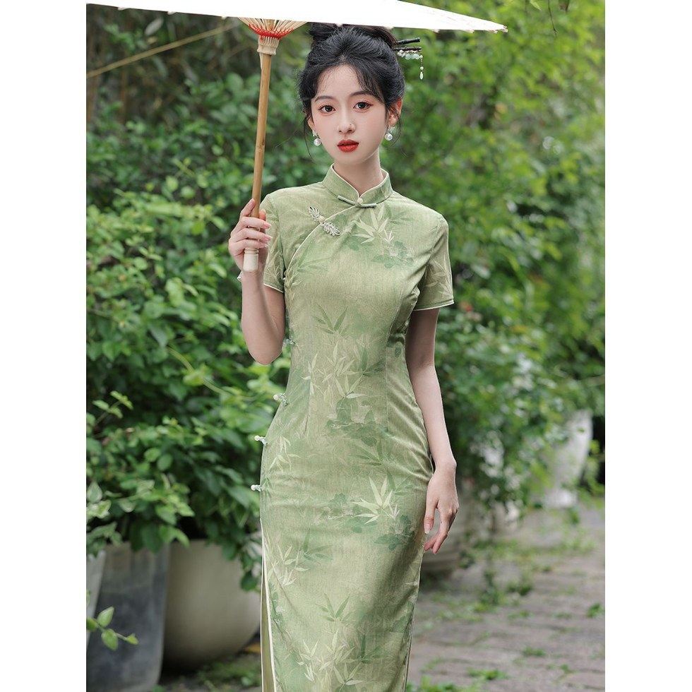 绿色送考旗袍女2025夏季年轻款高端长款日常改良高考中考一路绿灯