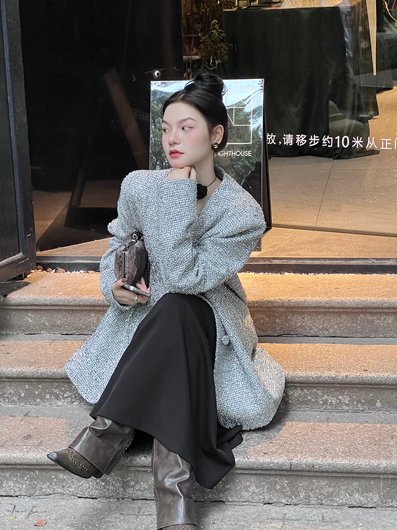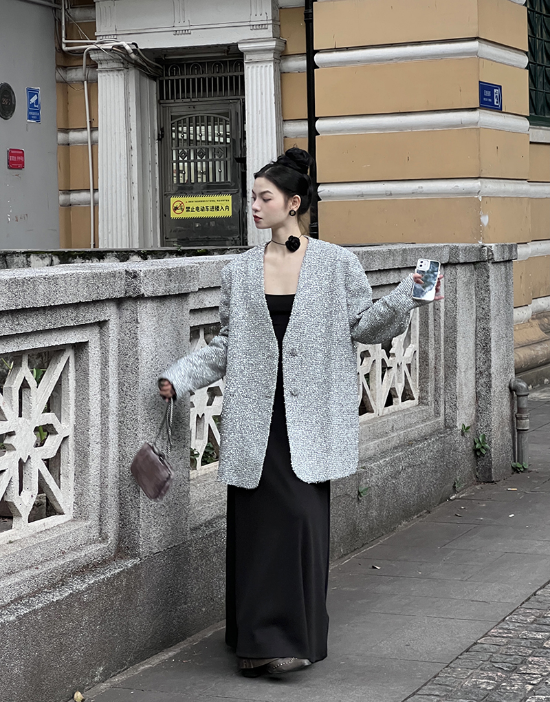 蒋哇塞 在逃公主 闪闪银色西装女气质名媛小香风外套百搭休闲上衣