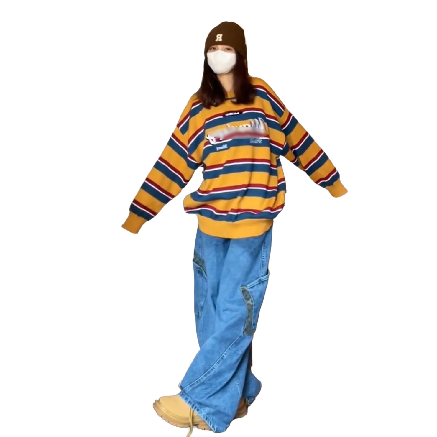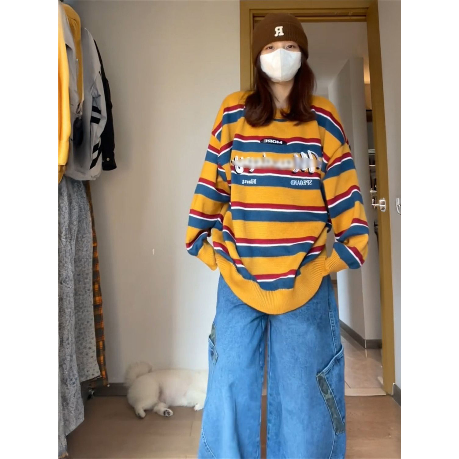 2025新款慵懒风条纹撞色字母提花长袖套头毛衣女学生宽松针织衫