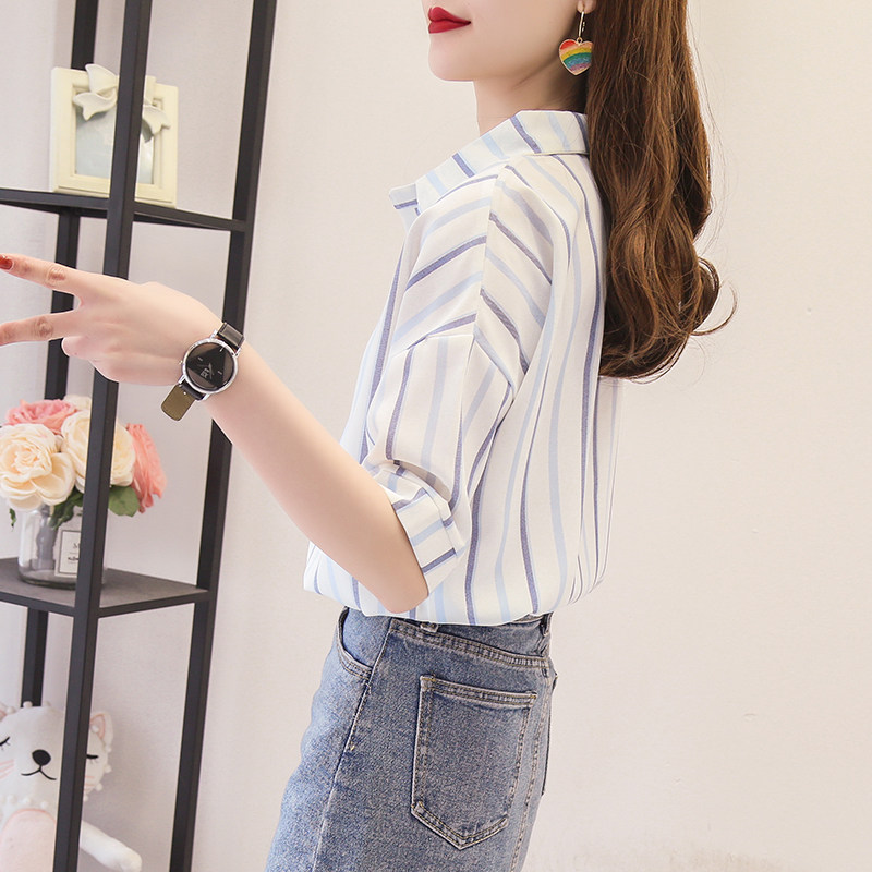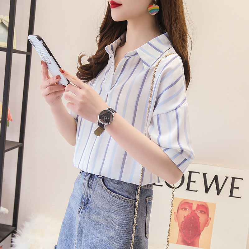 蓝色竖条纹夏季新款韩版中袖衬衫