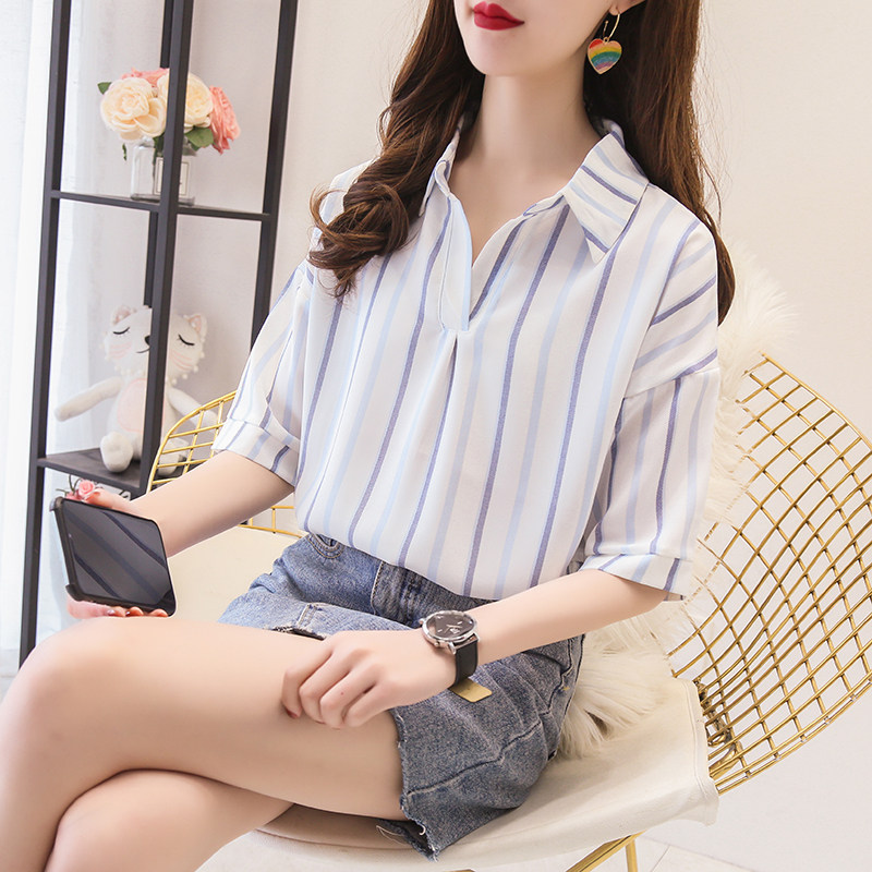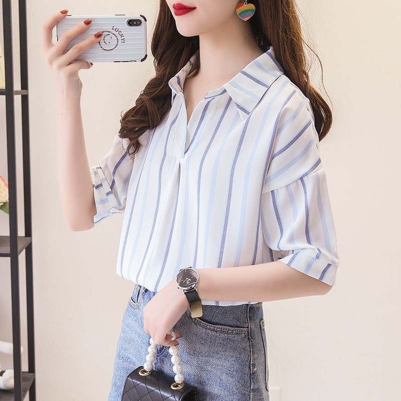 蓝色竖条纹衬衫女2023夏季新款韩版v领宽松中袖上衣薄款学生外套