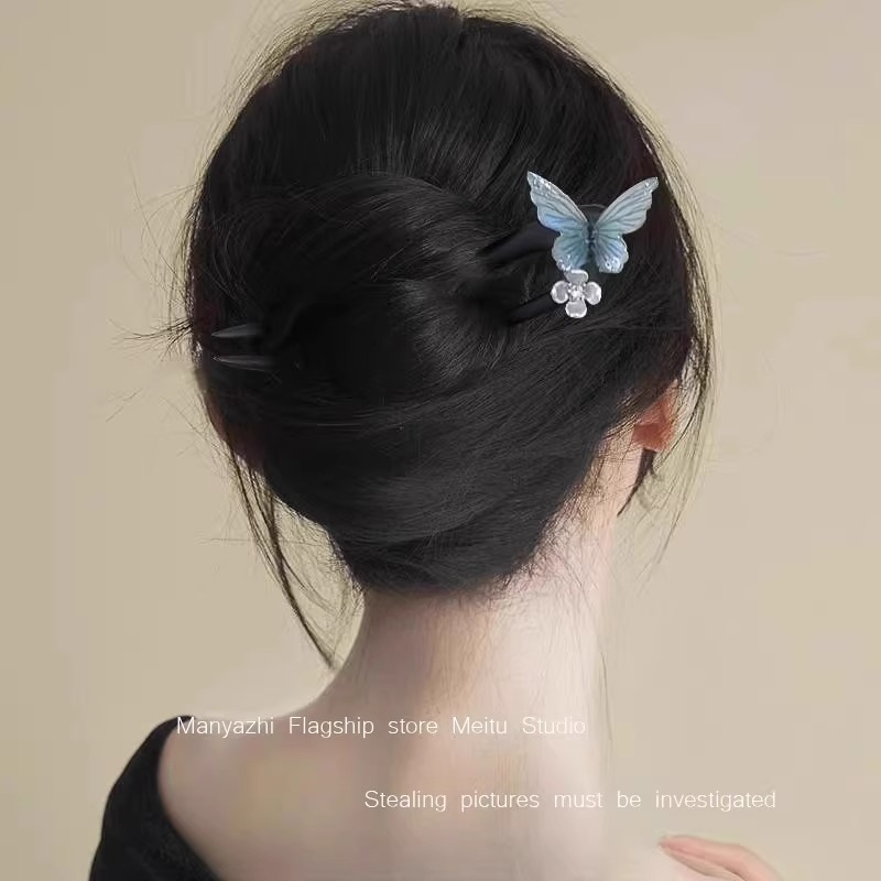 2025新款蓝色蝴蝶发簪新中式复古玉兰超仙花朵木簪马面裙汉服发钗