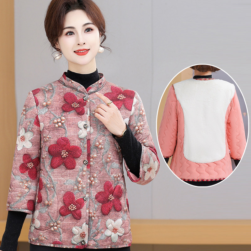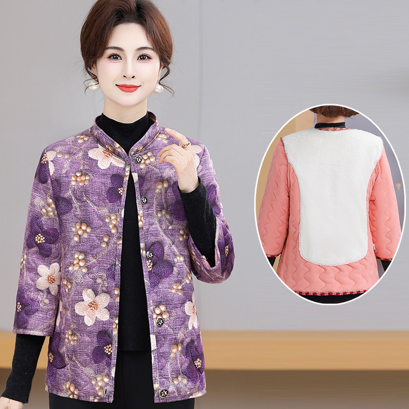 七色玉米妈妈装七分袖碎花棉衣中老年女立领加绒保暖外套棉服大码