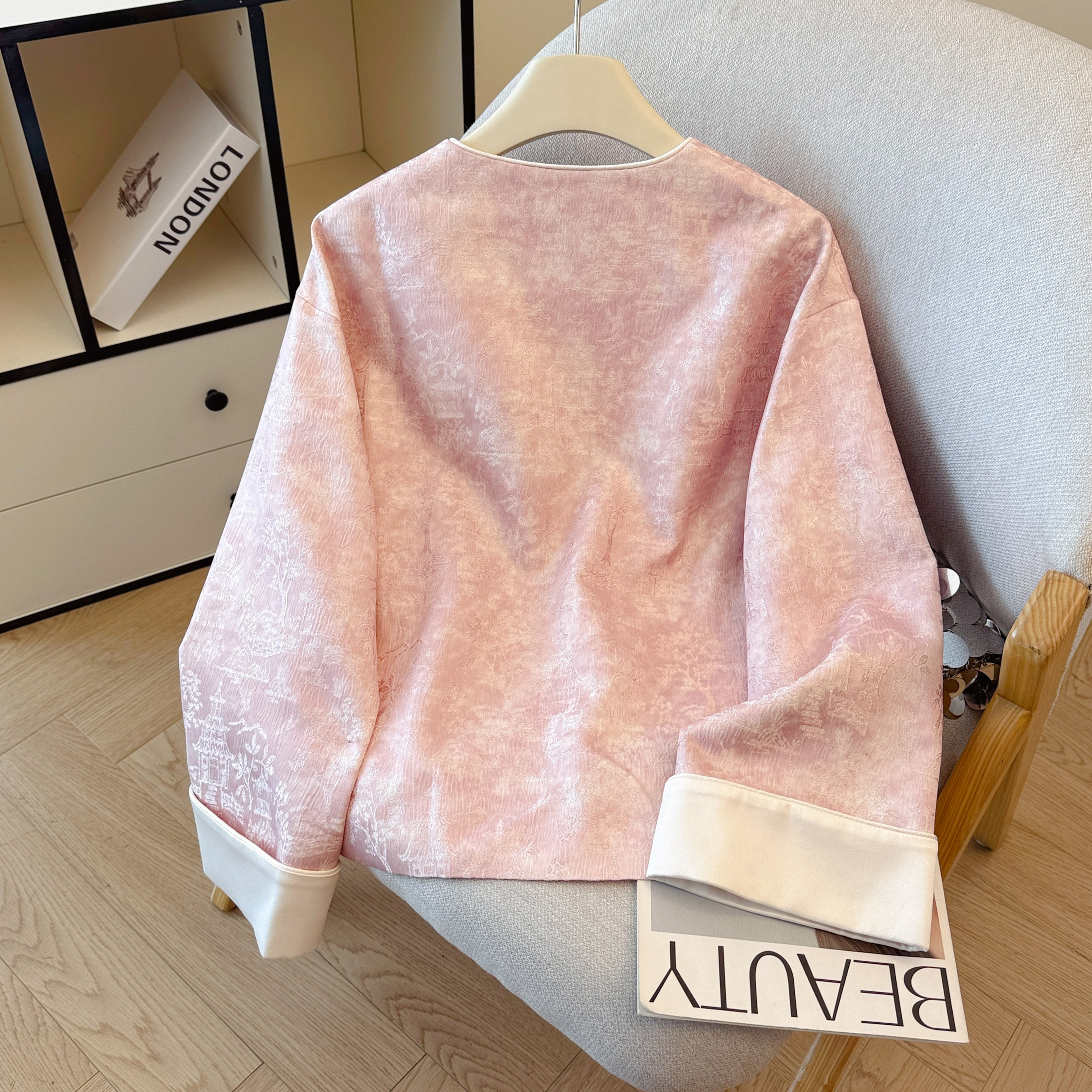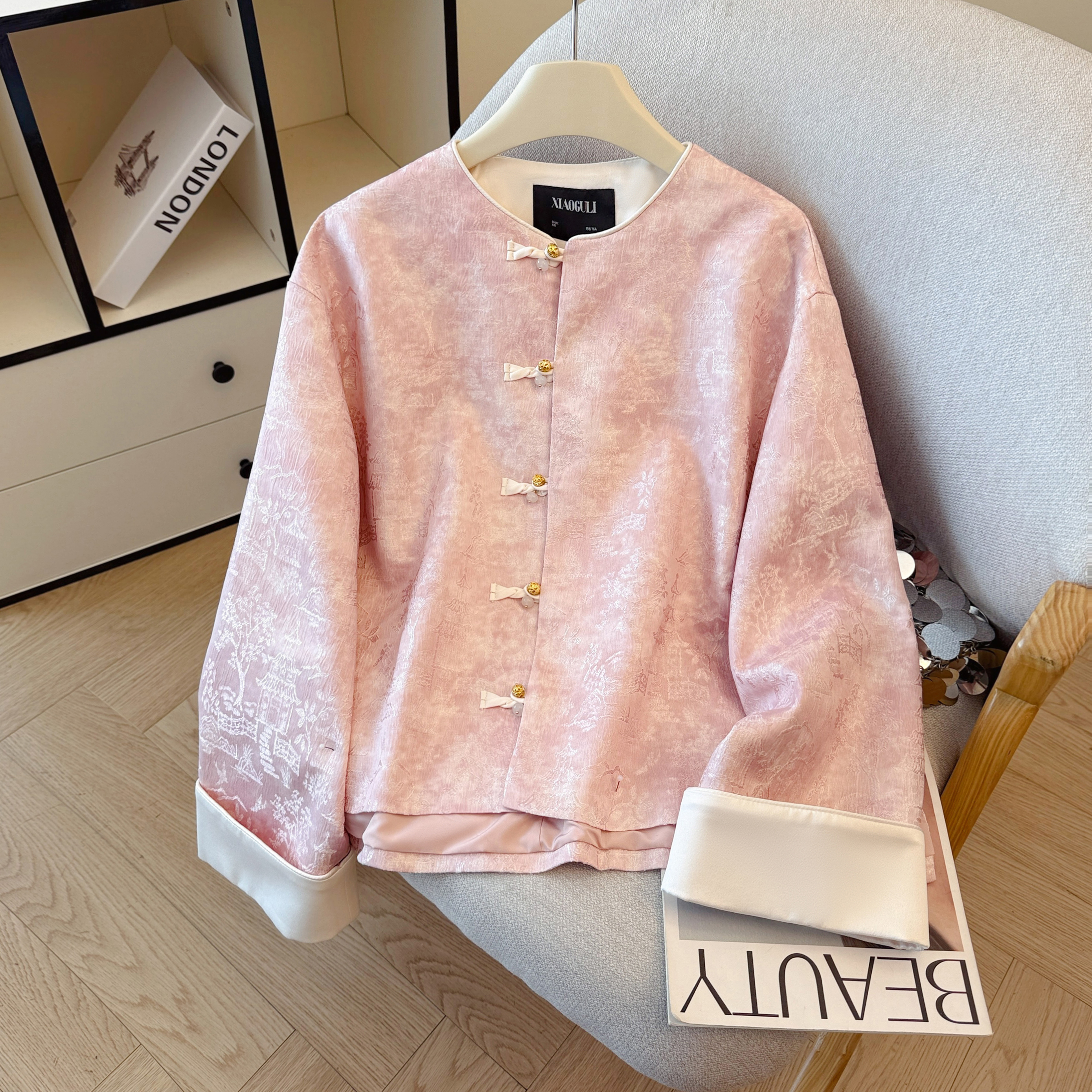 新中式国风圆领提花外套女2025春秋新款复古盘扣粉色唐装百搭上衣