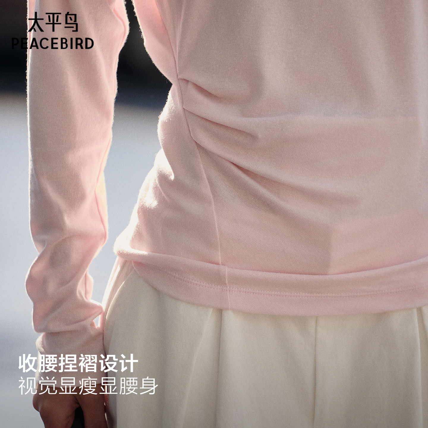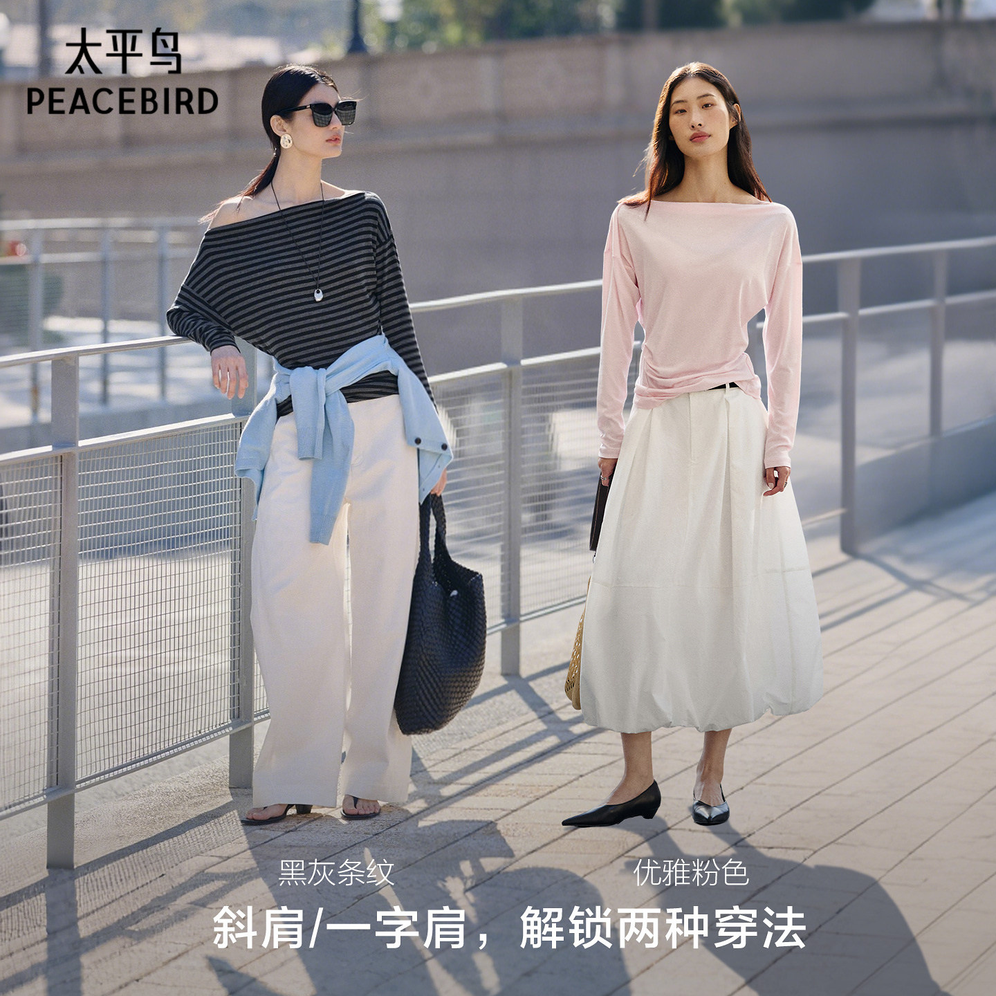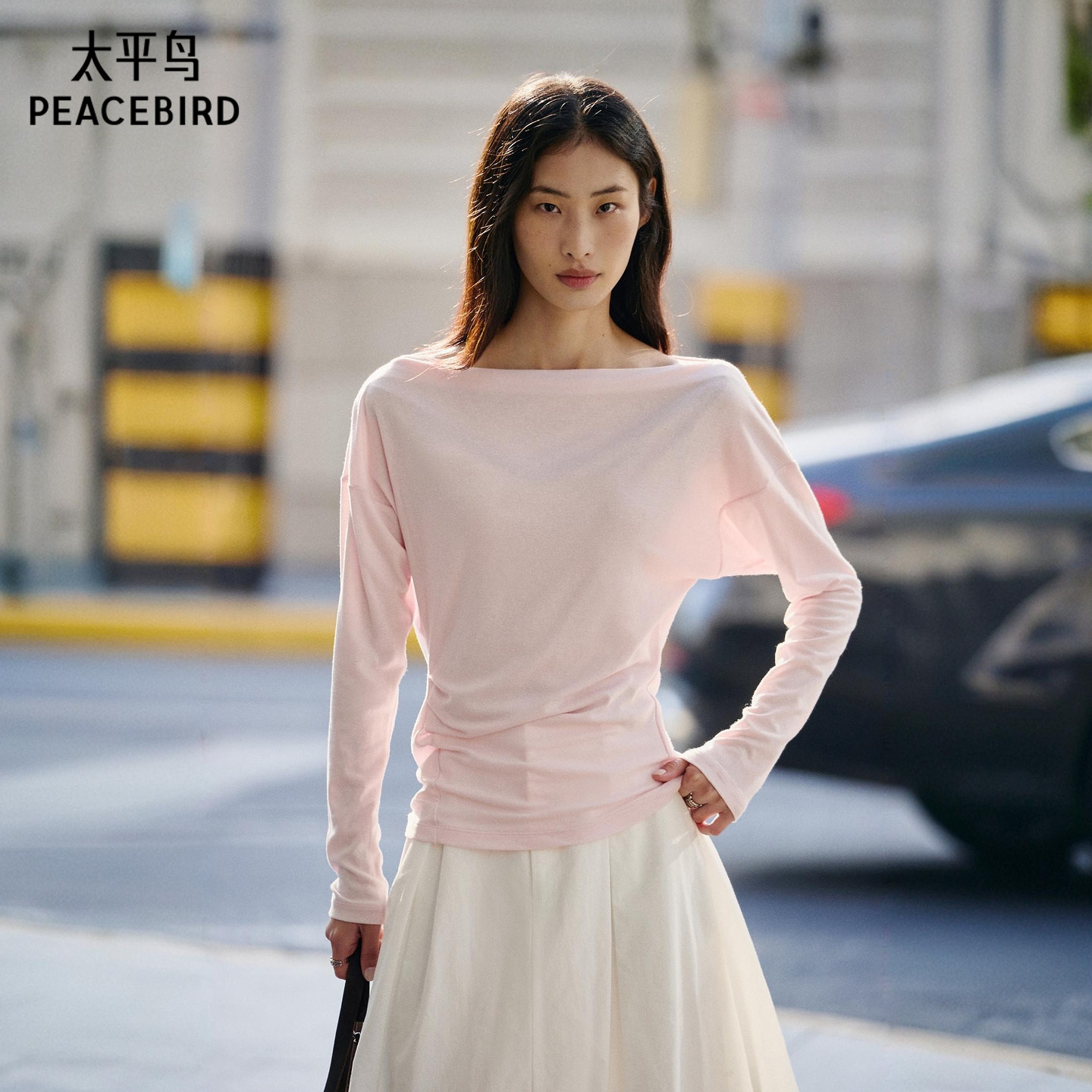 太平鸟莱赛尔亚麻混纺一字肩斜肩长袖T恤26春新款蝙蝠袖收腰上衣