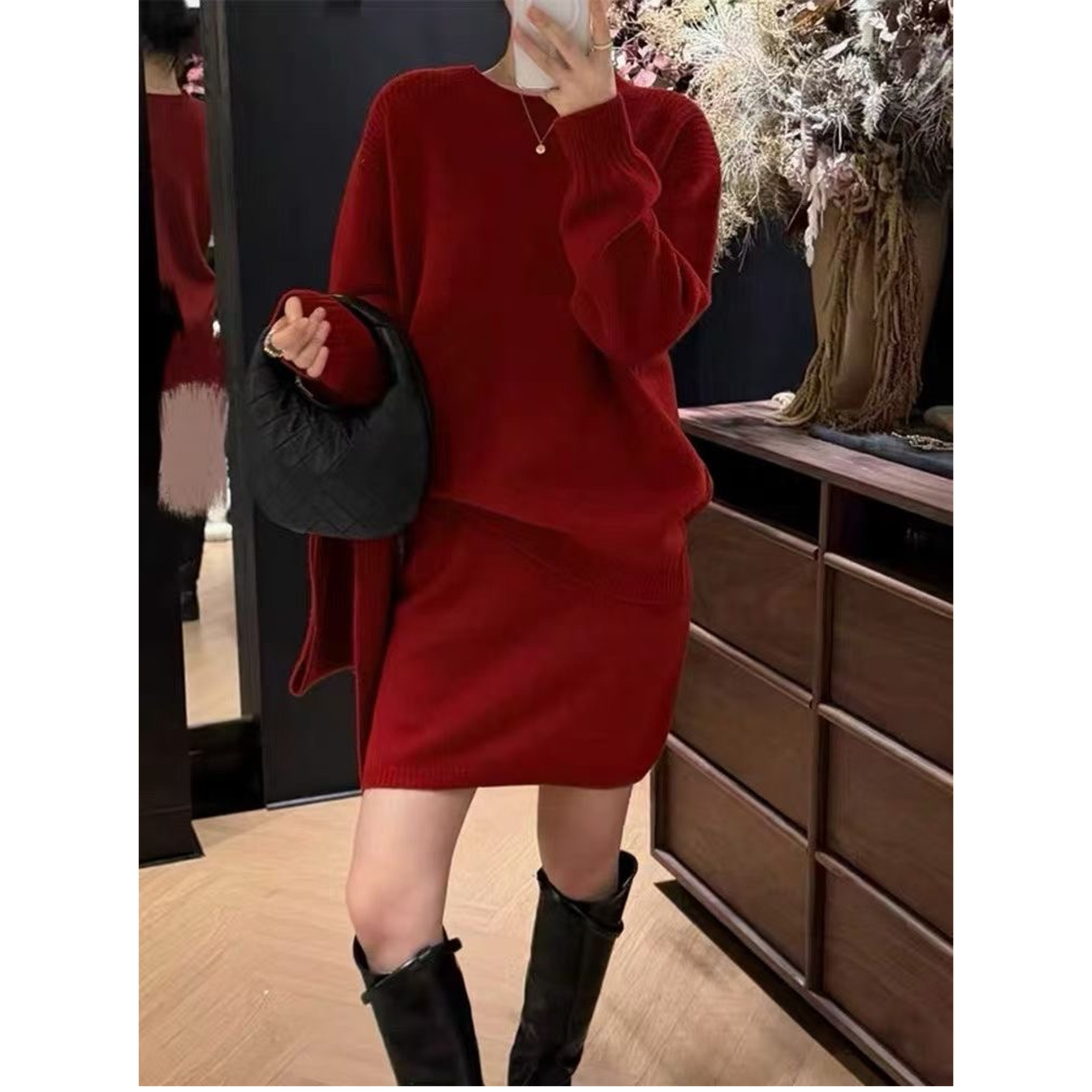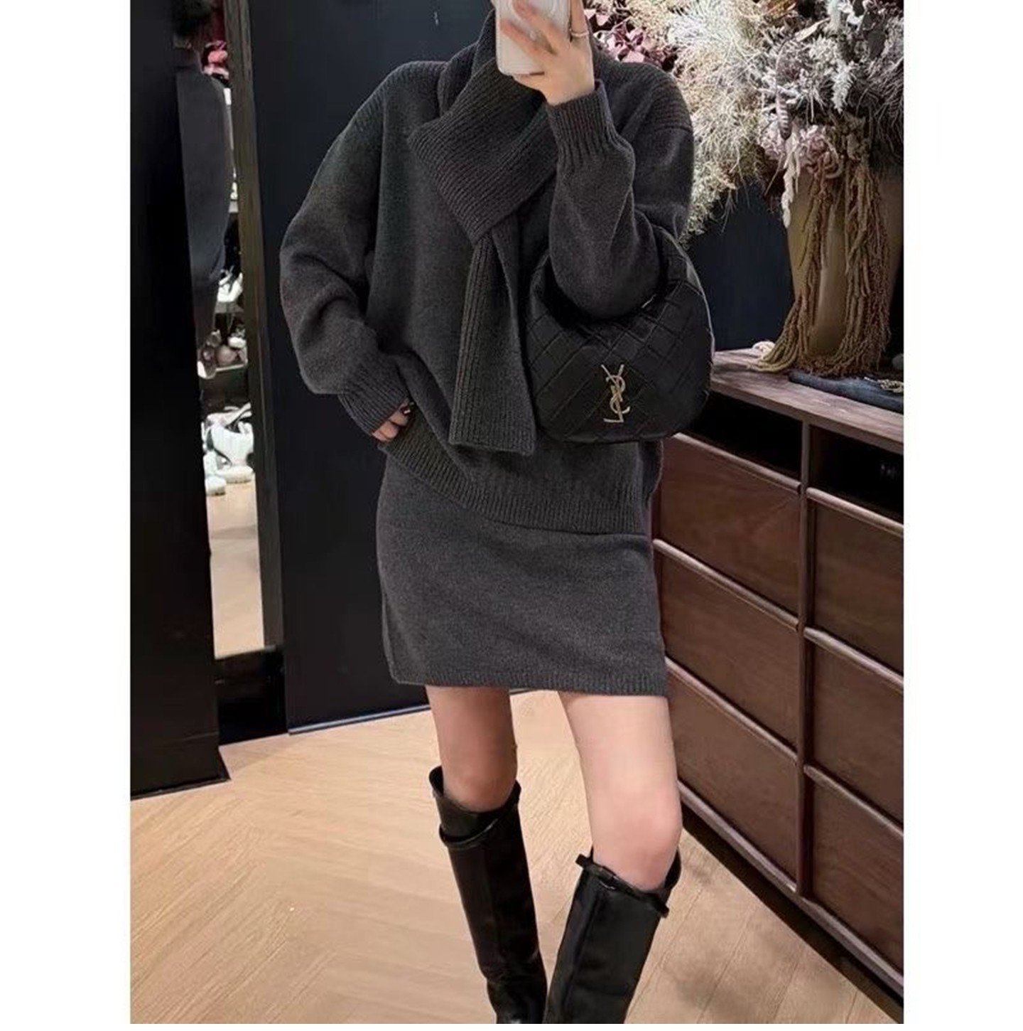 欧洲站2025冬装新款女圆领围巾套头羊毛毛衣+针织短裙套装三件套