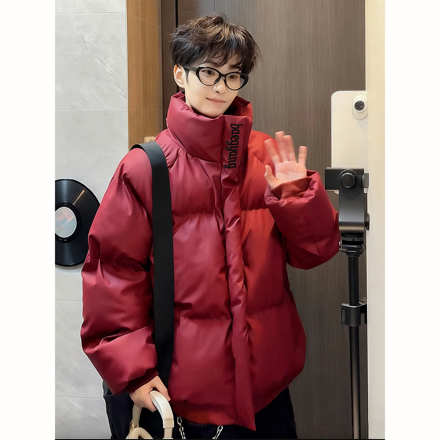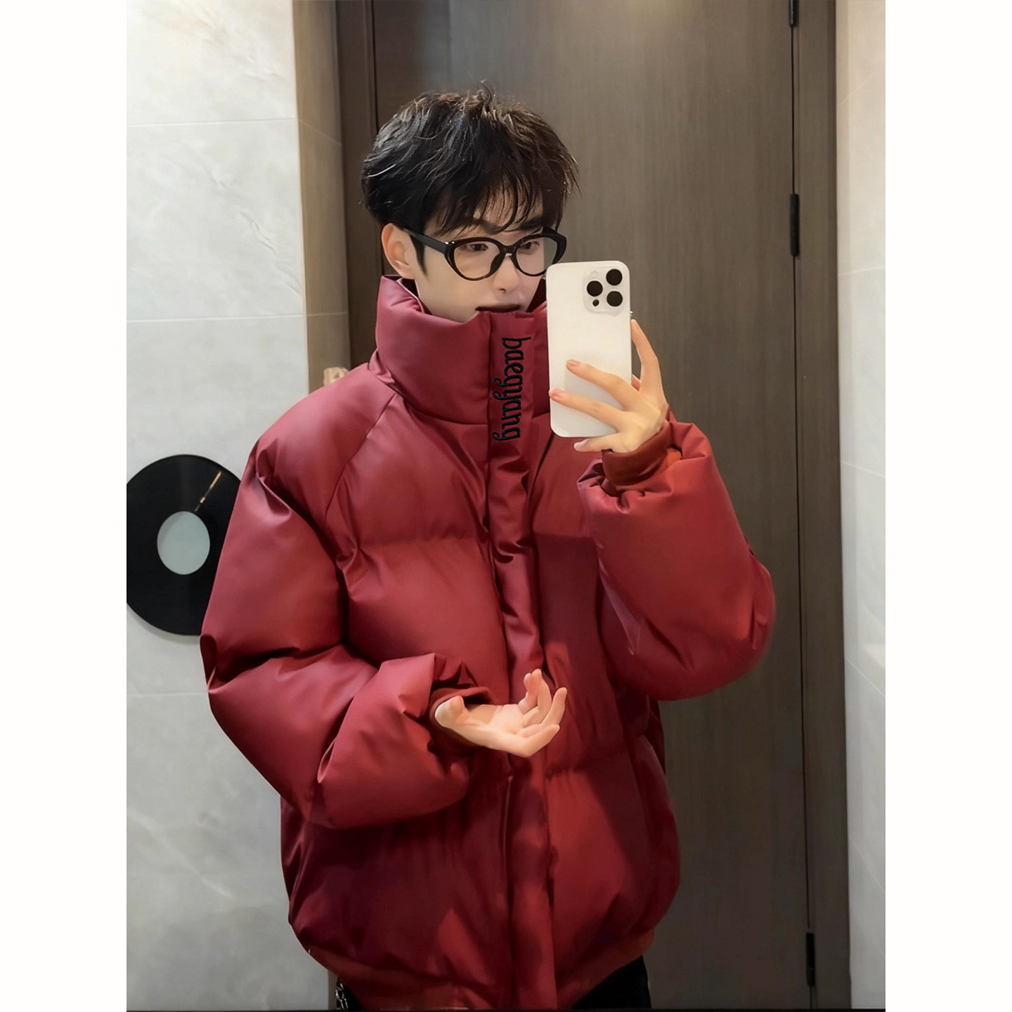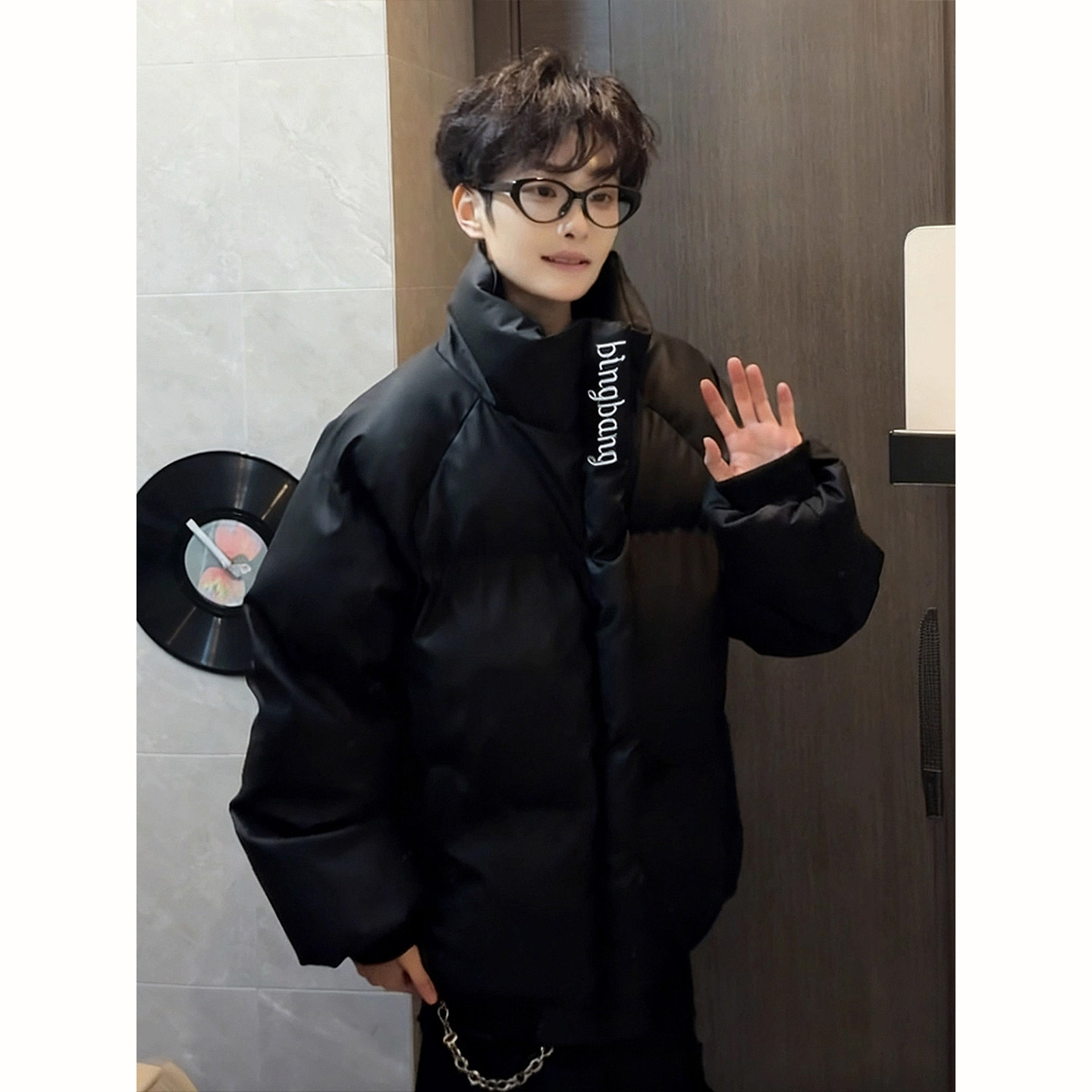 黑色皮刺绣羽绒棉服男生冬装外套抗寒加厚保暖棉服情侣立领面包服