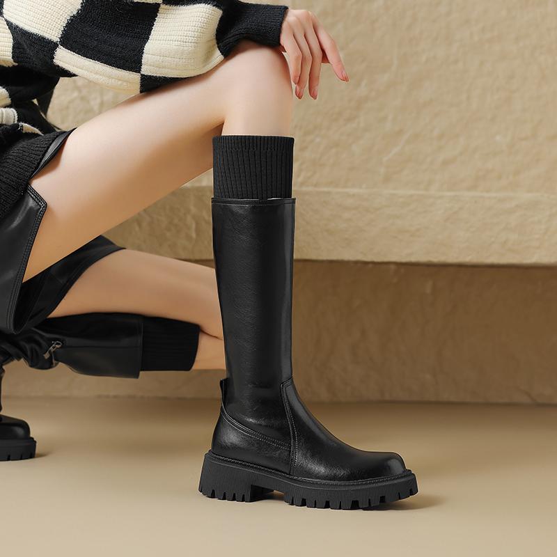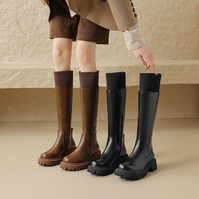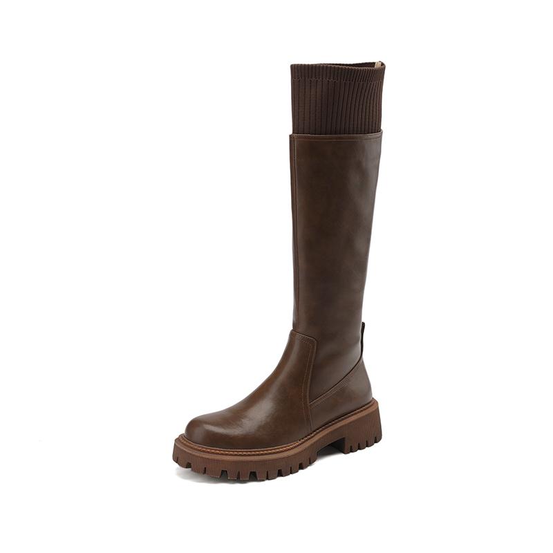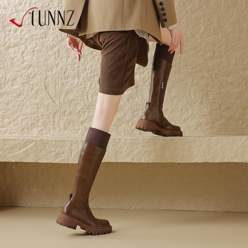 hunnz不过膝棕色厚底高筒骑士靴子女长筒靴秋冬真皮显瘦中跟粗跟