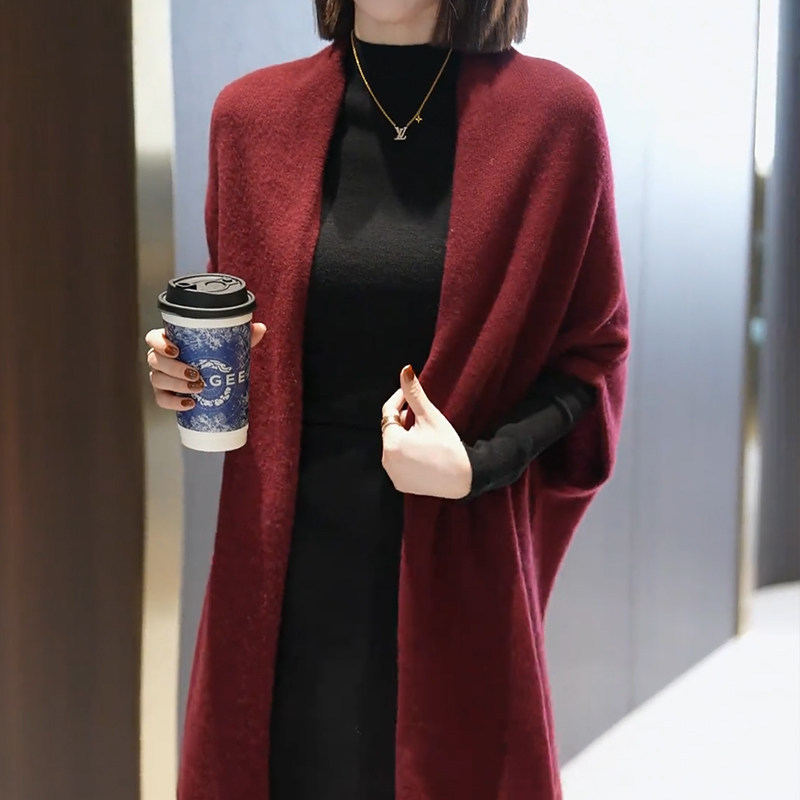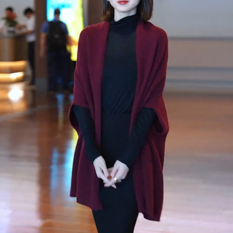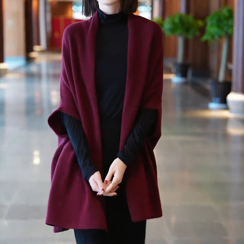 高级感羊毛酒红色披肩女外搭2025新款时尚气质纯色开衫外套针织衫