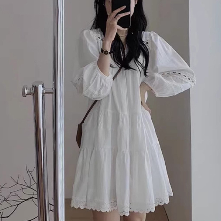 春夏法式白色泡泡袖衬衫连衣裙女春秋新款学生长袖穿搭中长款裙子