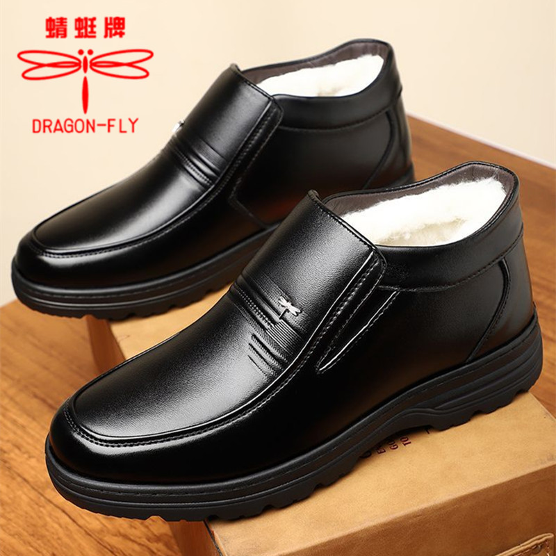 蜻蜓牌棉鞋男冬季加绒保暖男士棉皮鞋加厚百搭套脚老人保暖皮棉鞋