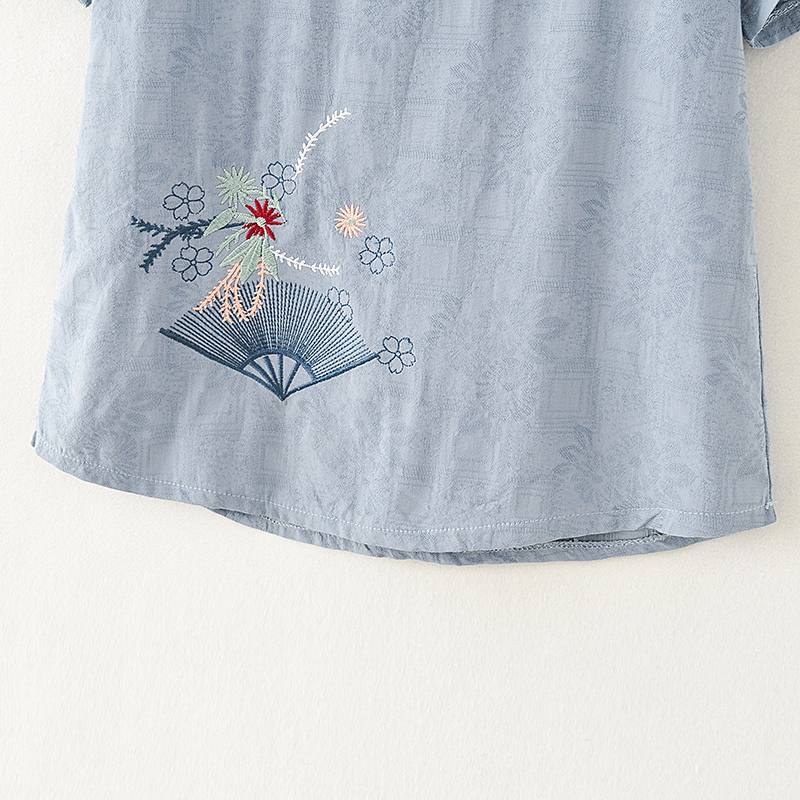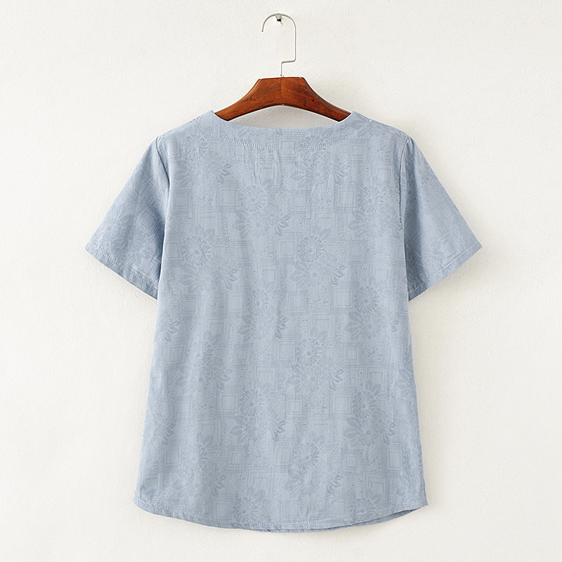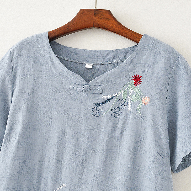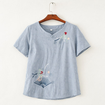 棉麻短袖t恤绣花宽松妈妈装小v领刺绣遮肉夏季上衣t恤小衫中年女
