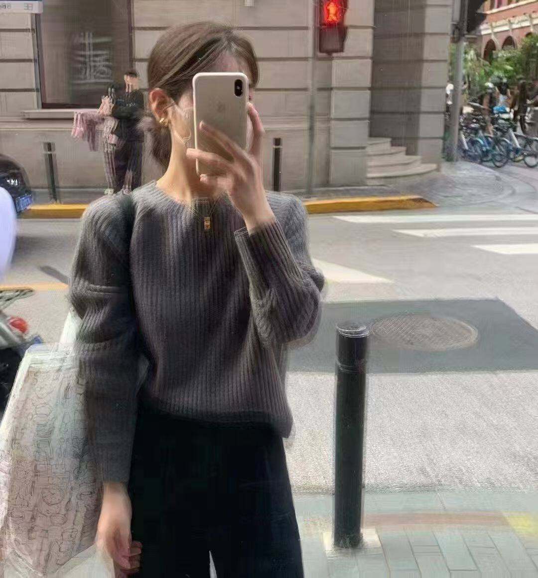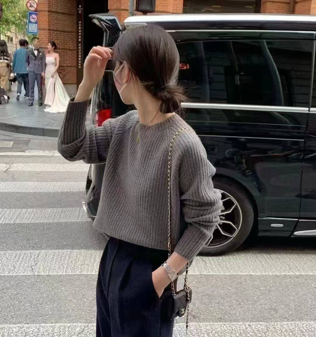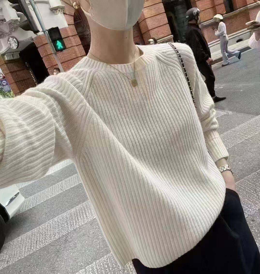 韩国东大门正品女装2025新款百搭圆领长袖纯色坑条针织衫女毛衣