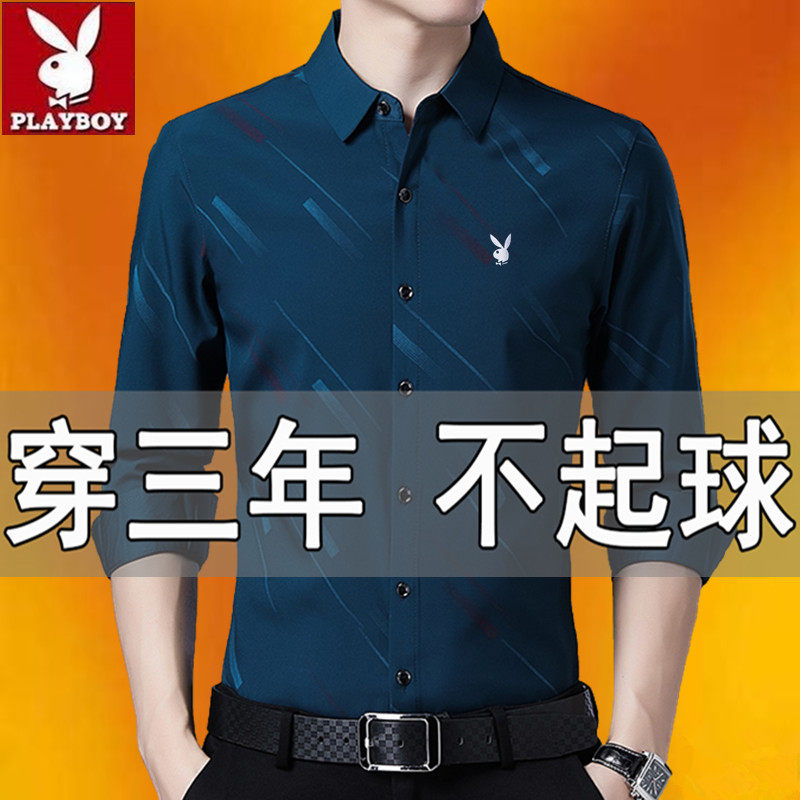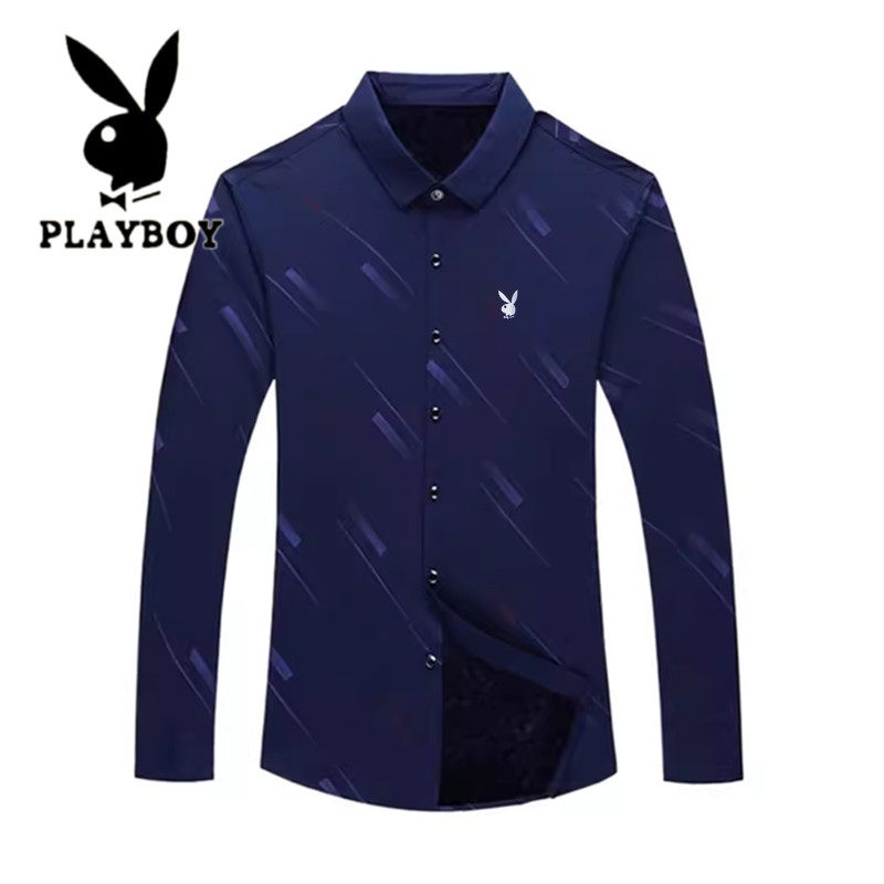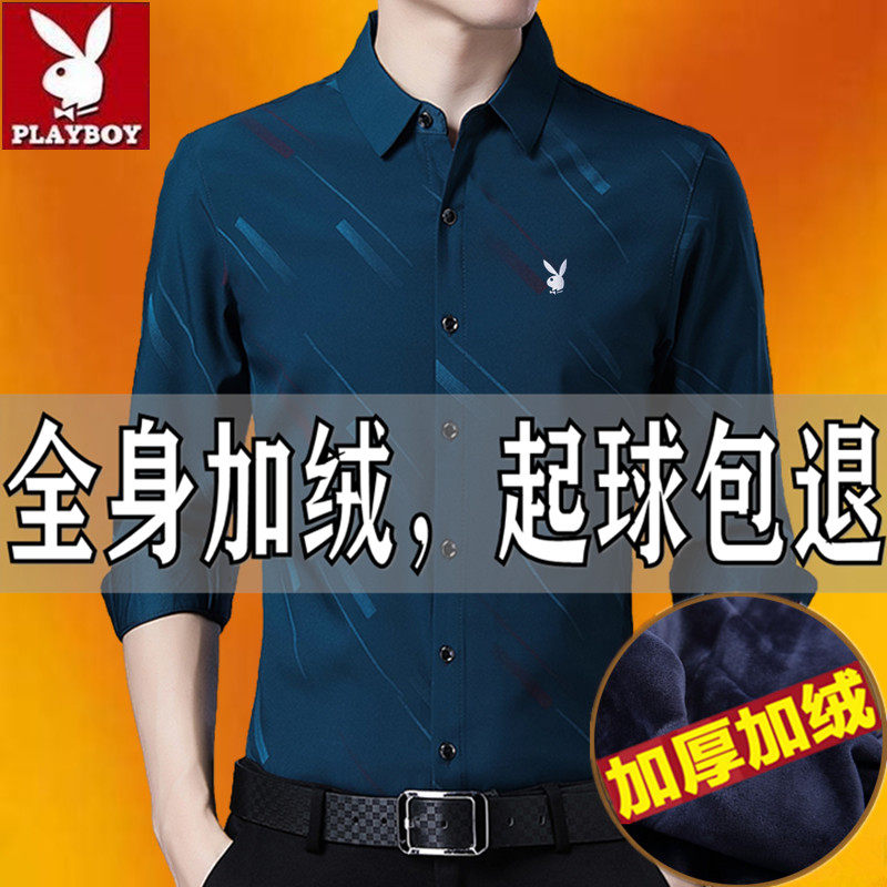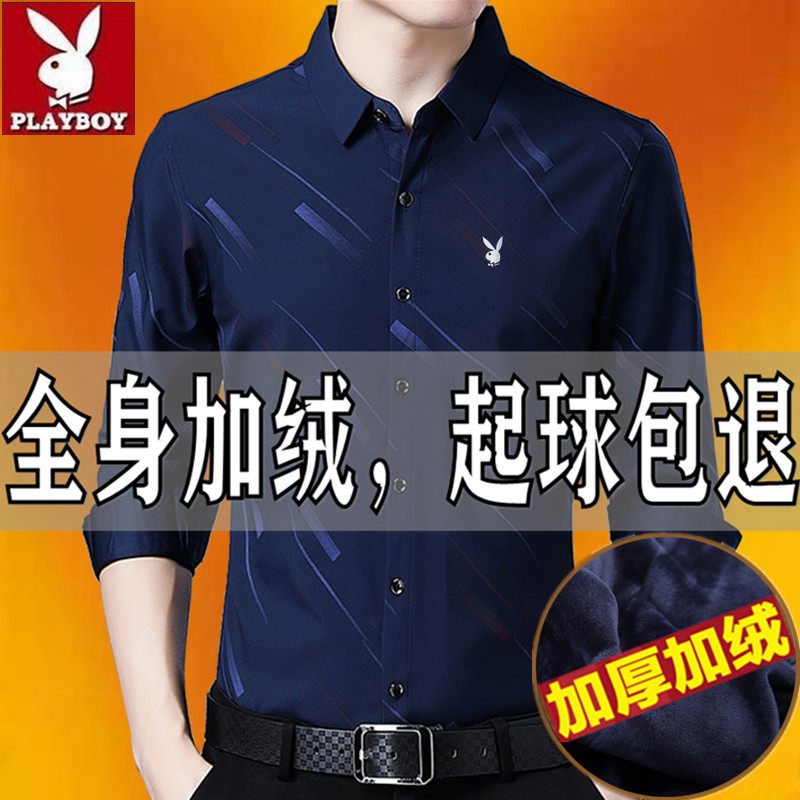 花花公子秋冬衬衫中年男士宽松大码丝光棉加绒加厚保暖爸爸装衬衣