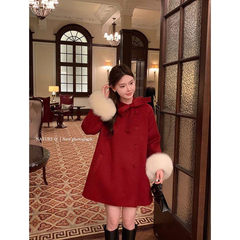 红色圣诞新年贺岁拼接呢子大衣富家千金狐狸毛斗篷高级感毛呢外套