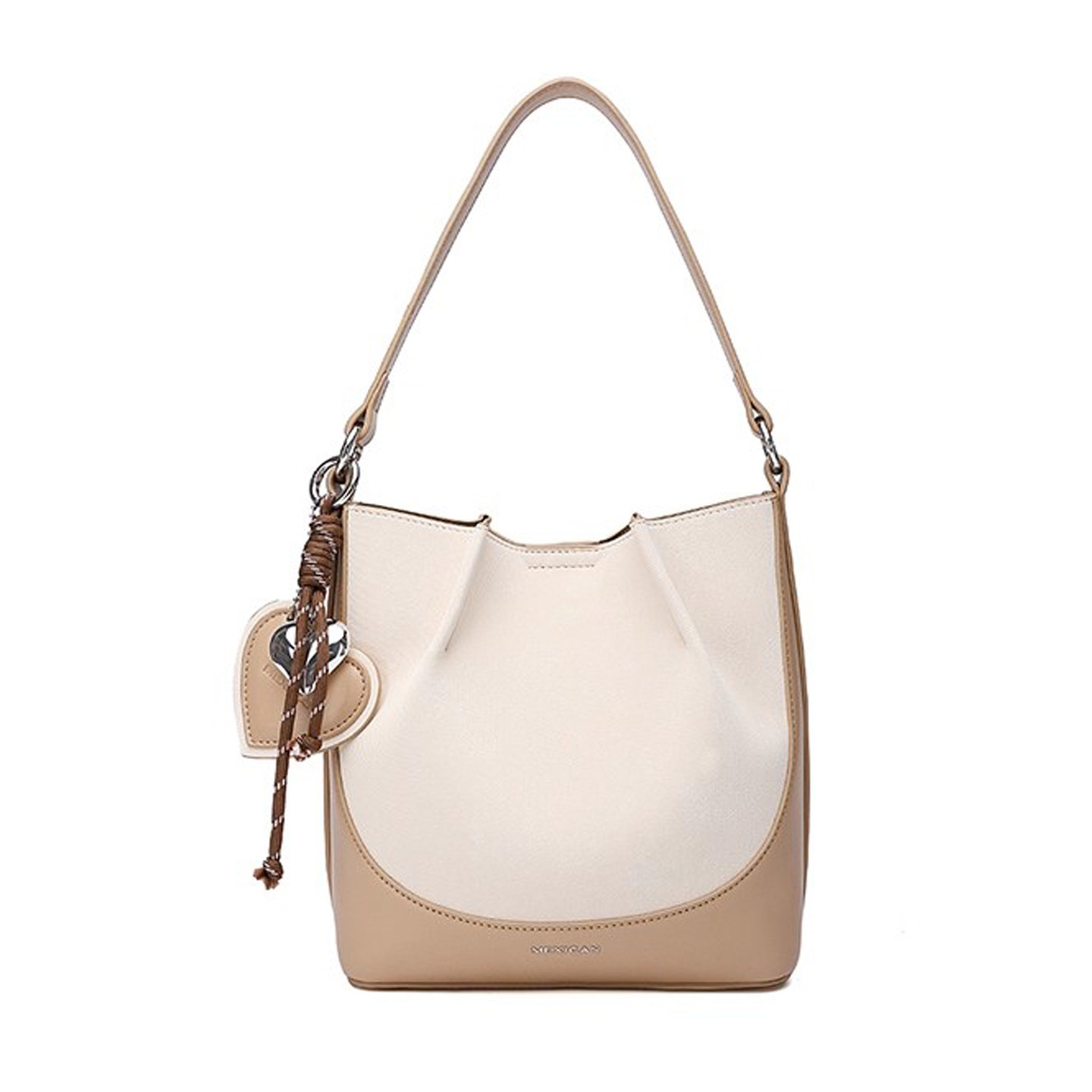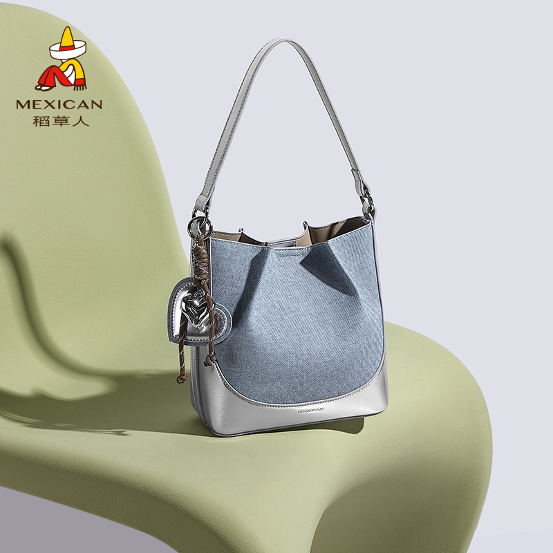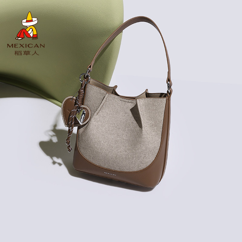 稻草人女士包包2025新款水桶包撞色挂件单肩包女士百搭斜挎包正品