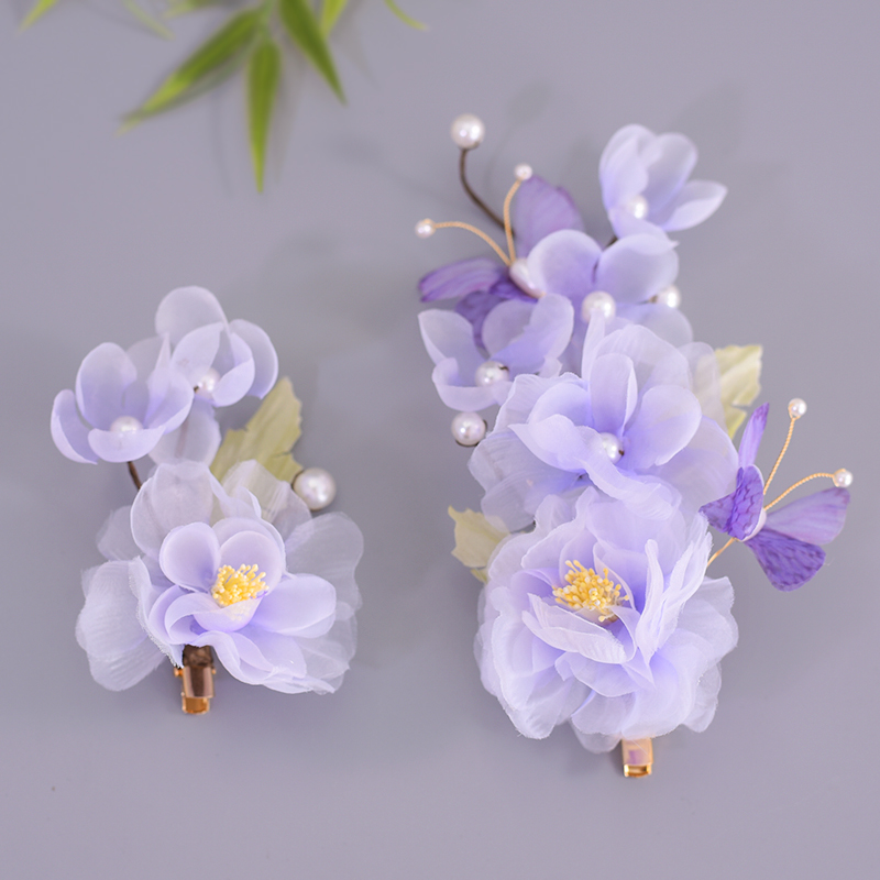 原创浅紫色发夹古风汉服旗袍国风烫花头饰发饰发夹饰品套装手工