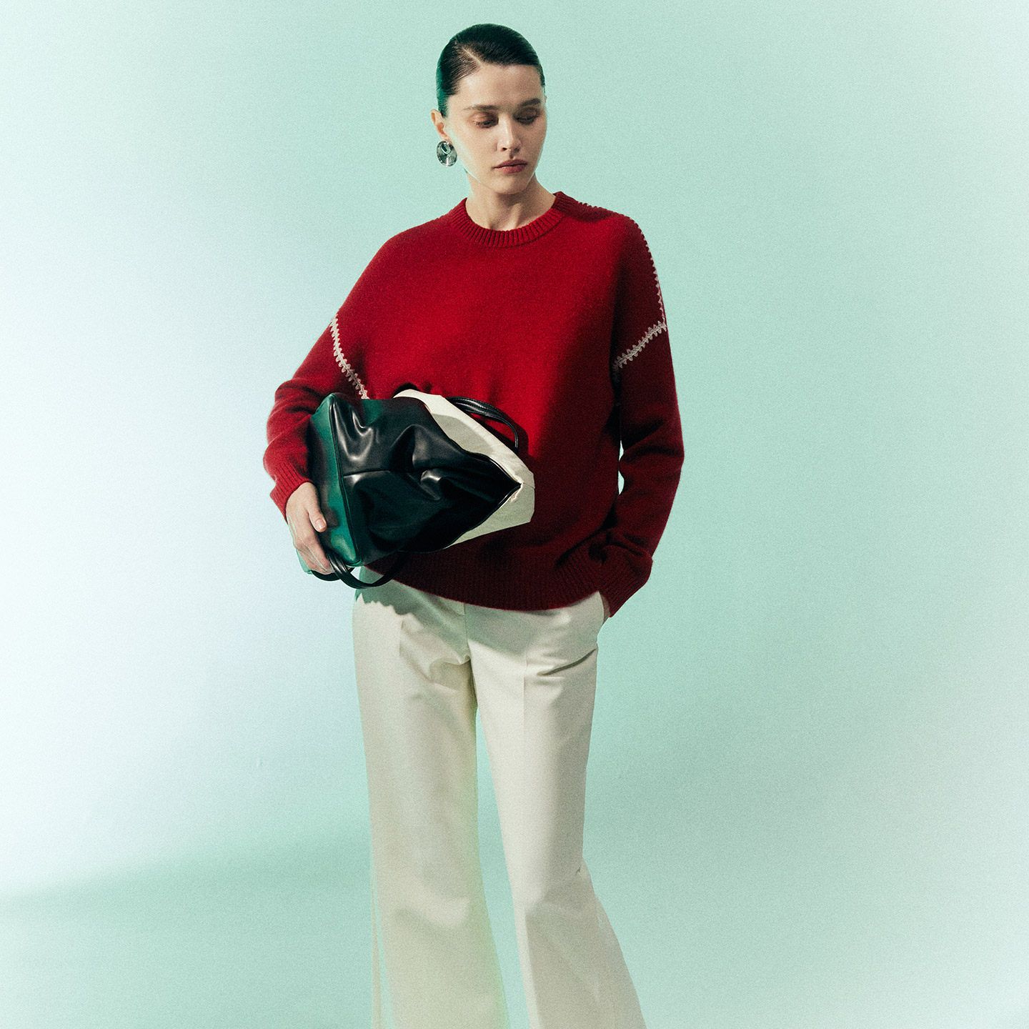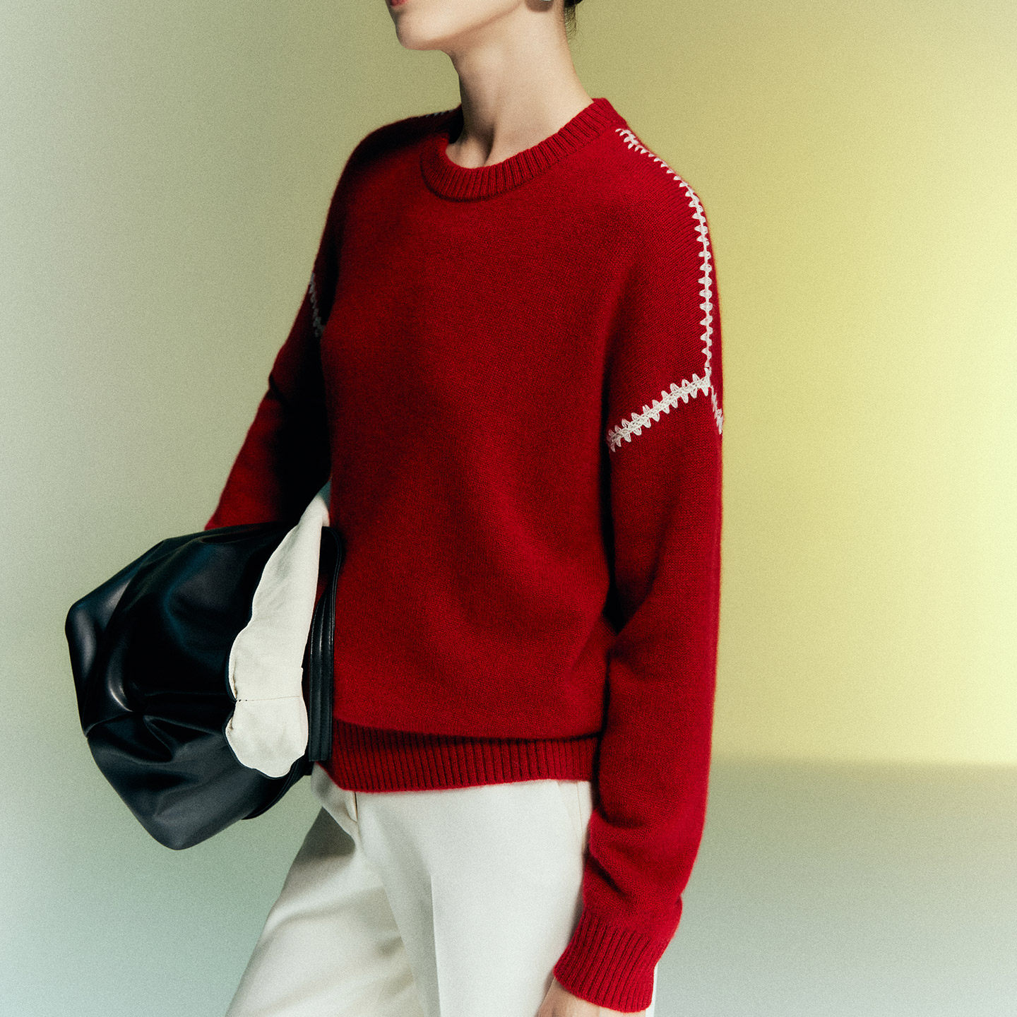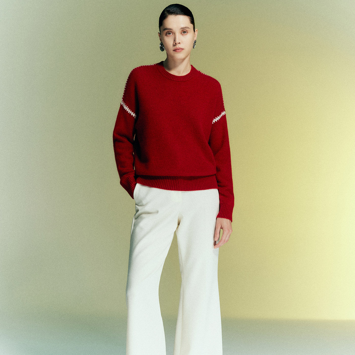 PALUOPO/帕罗【商场同款RED红标】秋冬圆领提花宽松纯山羊绒衫女