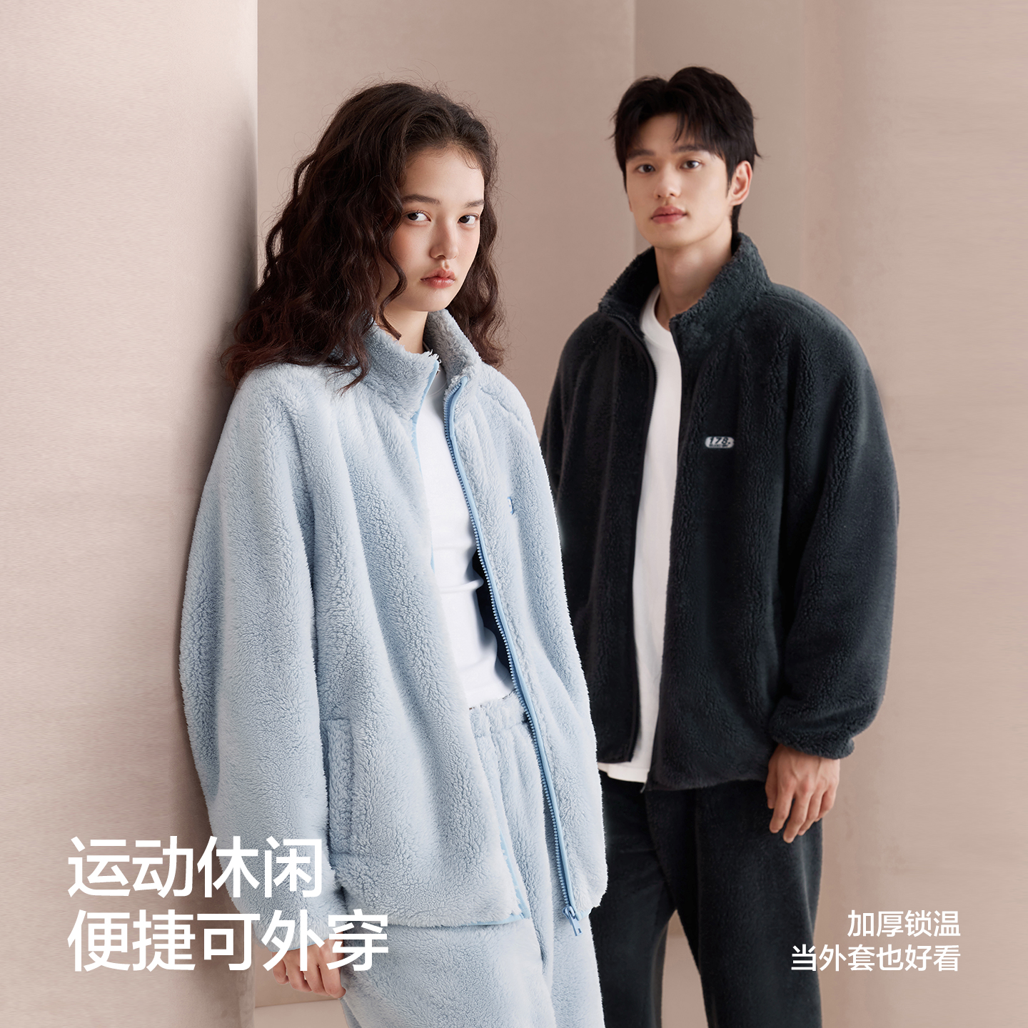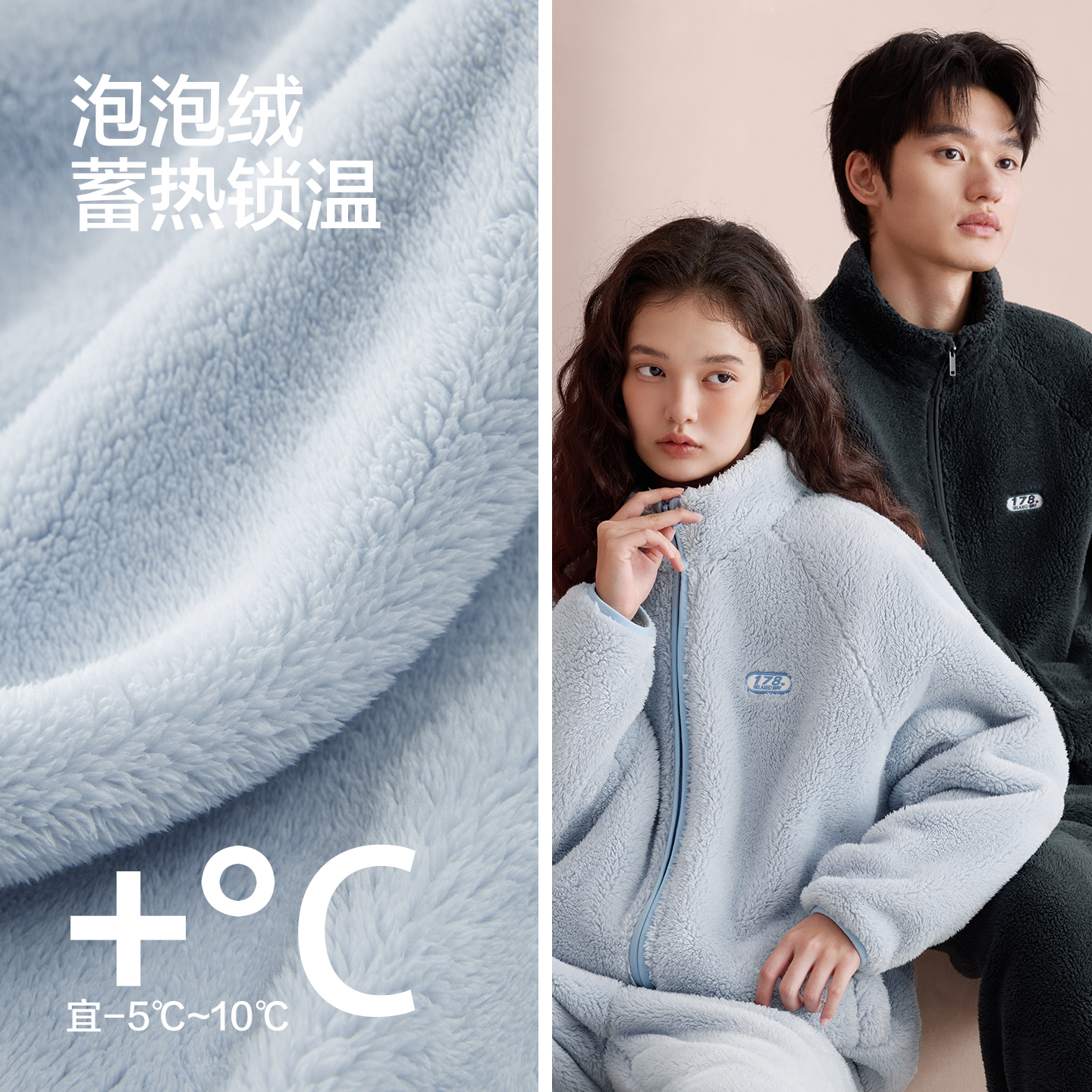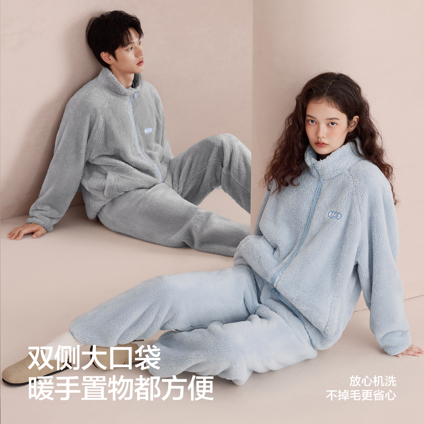 红豆居家情侣睡衣珊瑚绒冬季立领拉链男抗静电加厚女套装摇粒绒