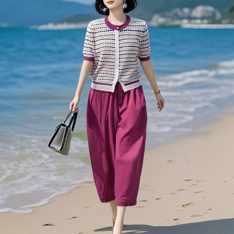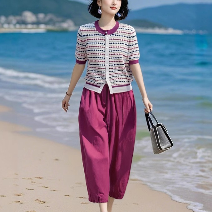 素雅订制原创品牌旗舰知性唯美树莓色冰丝针织衫松紧腰哈伦裤套装