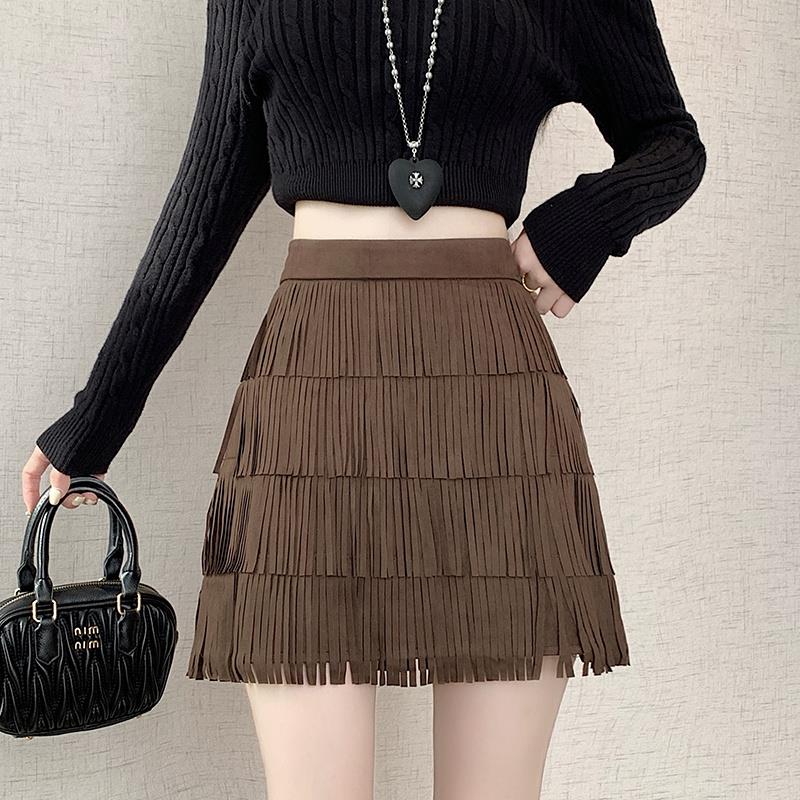 短裙半身裙女秋冬2025新款高腰设计感复古流苏咖色a字一步包臀裙
