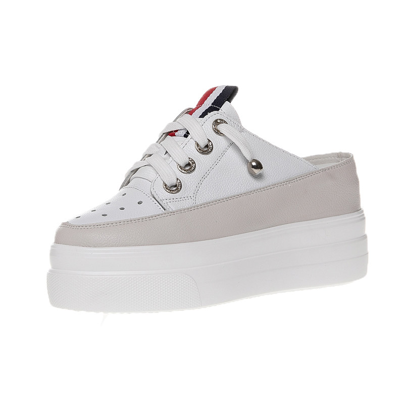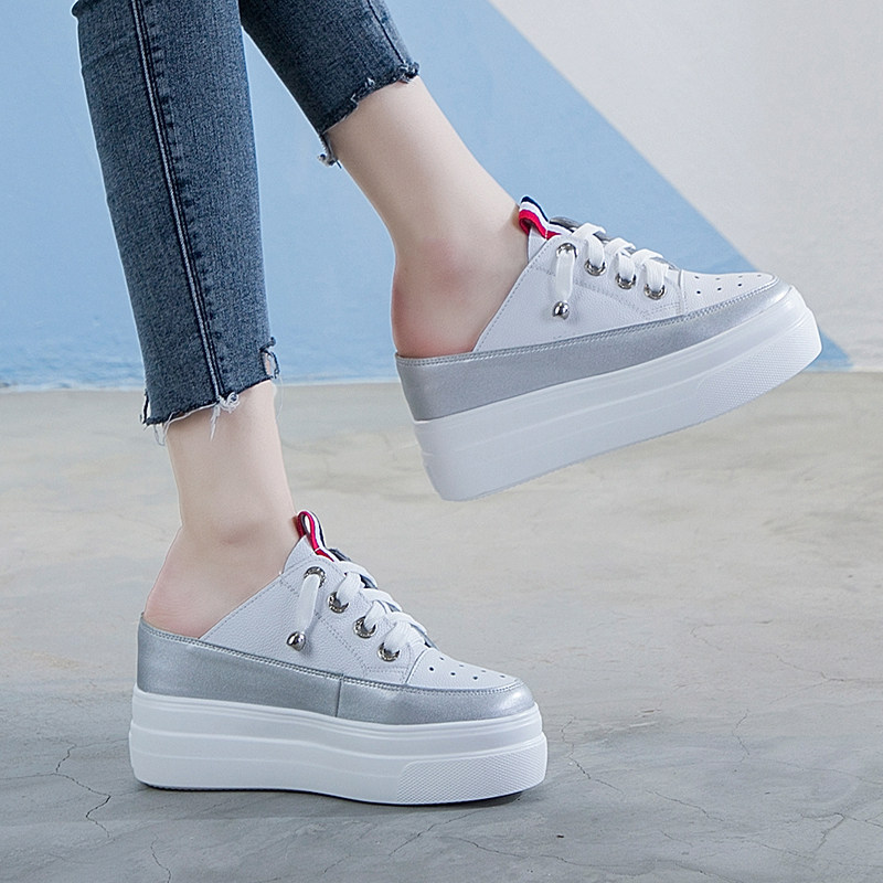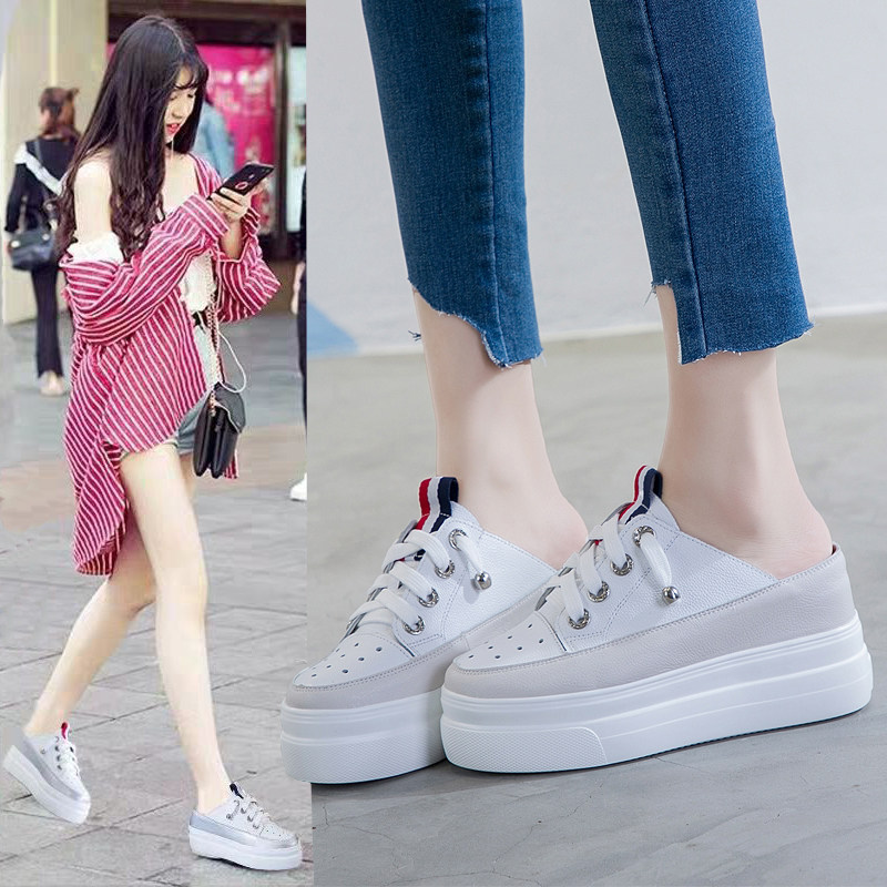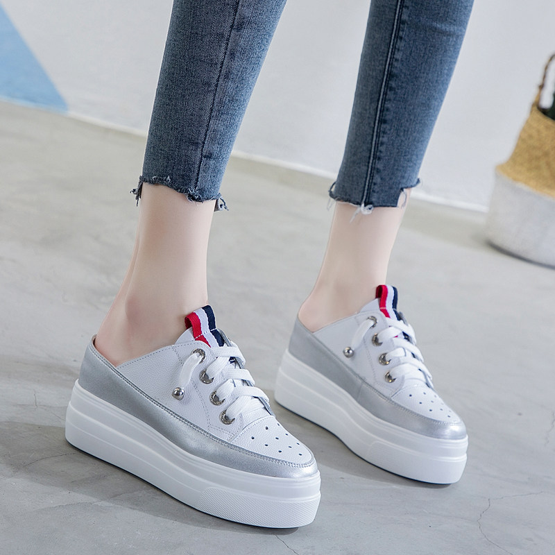 真皮包头透气内增高半拖鞋女夏新款凉鞋高跟厚底白色松糕懒人凉拖