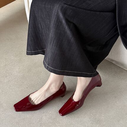 极简风~真皮法式气质方头浅口粗跟百搭通漆皮红色单鞋女2026新款