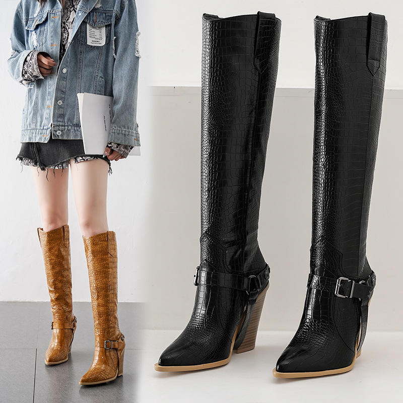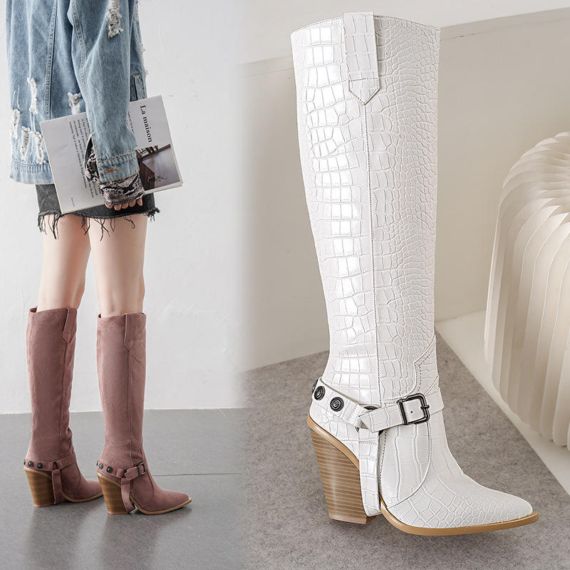 速卖通WISH亚马逊女高筒靴秋冬女鞋尖头异型粗跟懒人套筒大码女靴