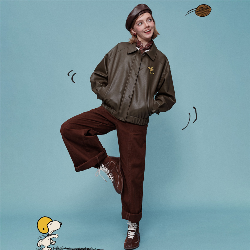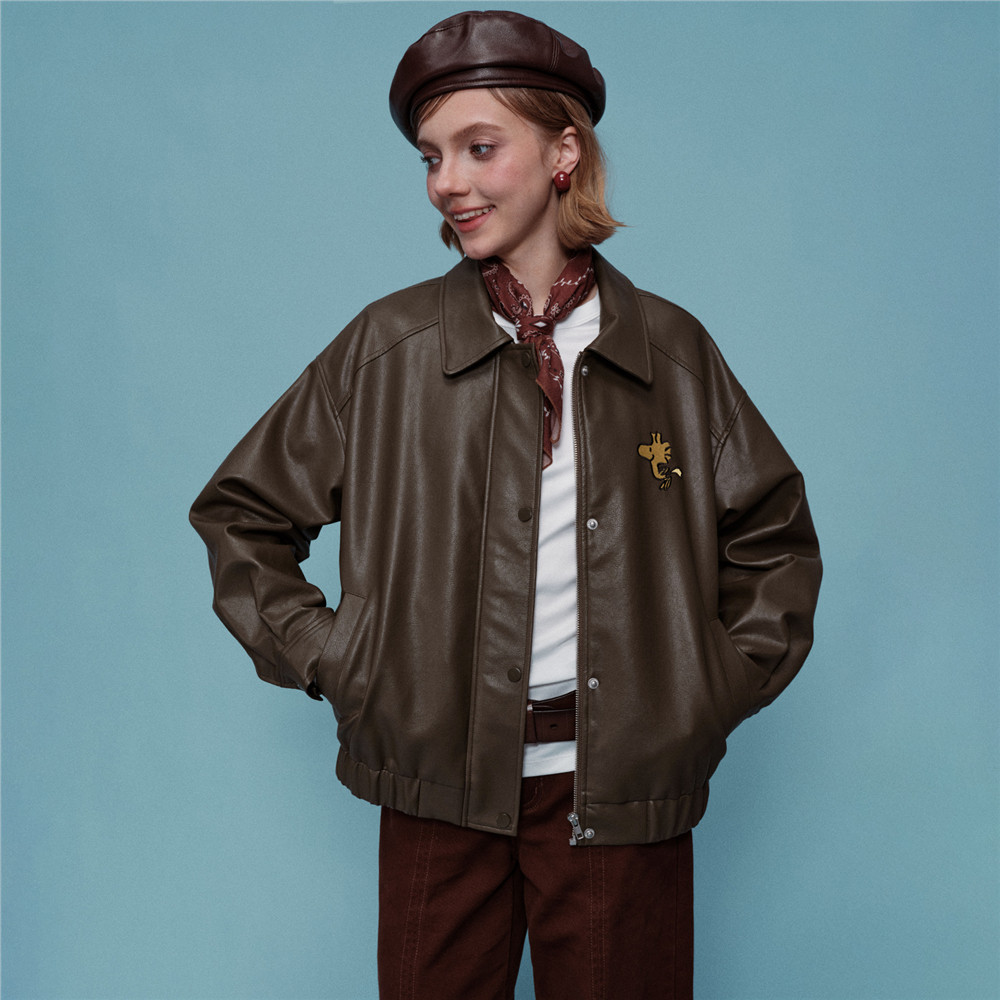 [史努比联名]佐丹奴皮衣外套女人造革刺绣宽松翻领皮夹克18375708
