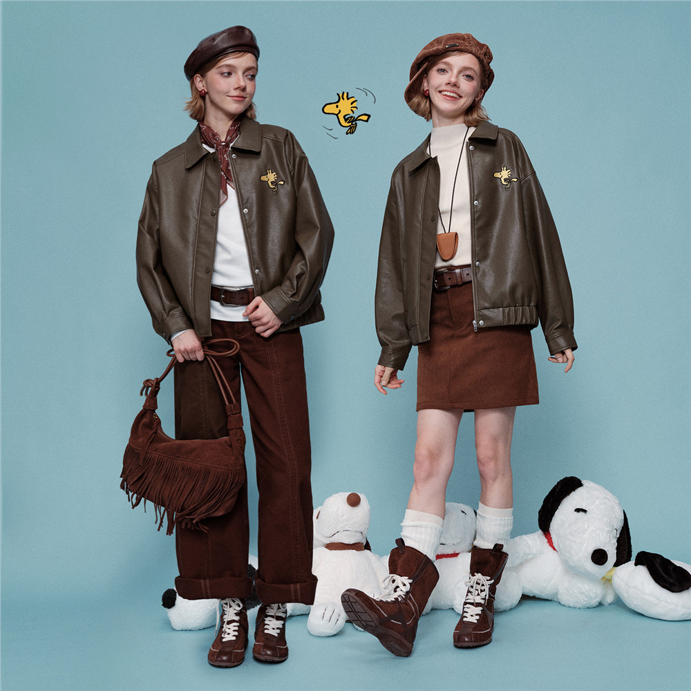 佐丹奴宽松史努比联名刺绣皮衣