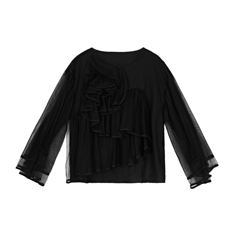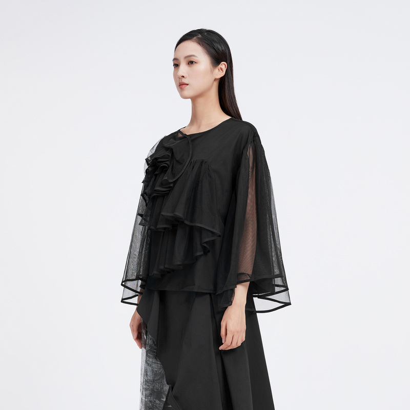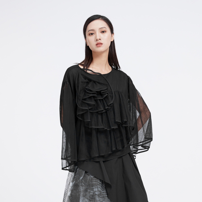 sdeer圣迪奥春秋装女装圆领立体裁剪网纱长袖衬衫S221Z0517