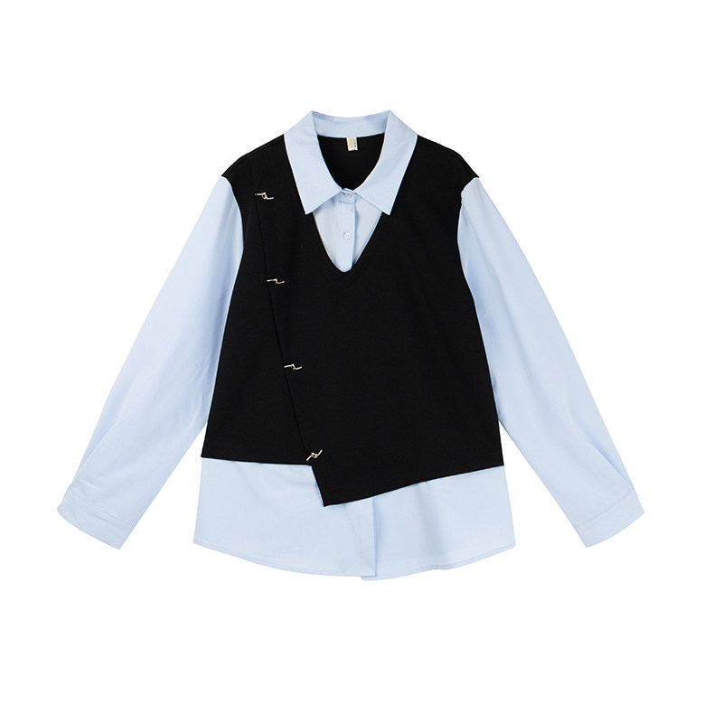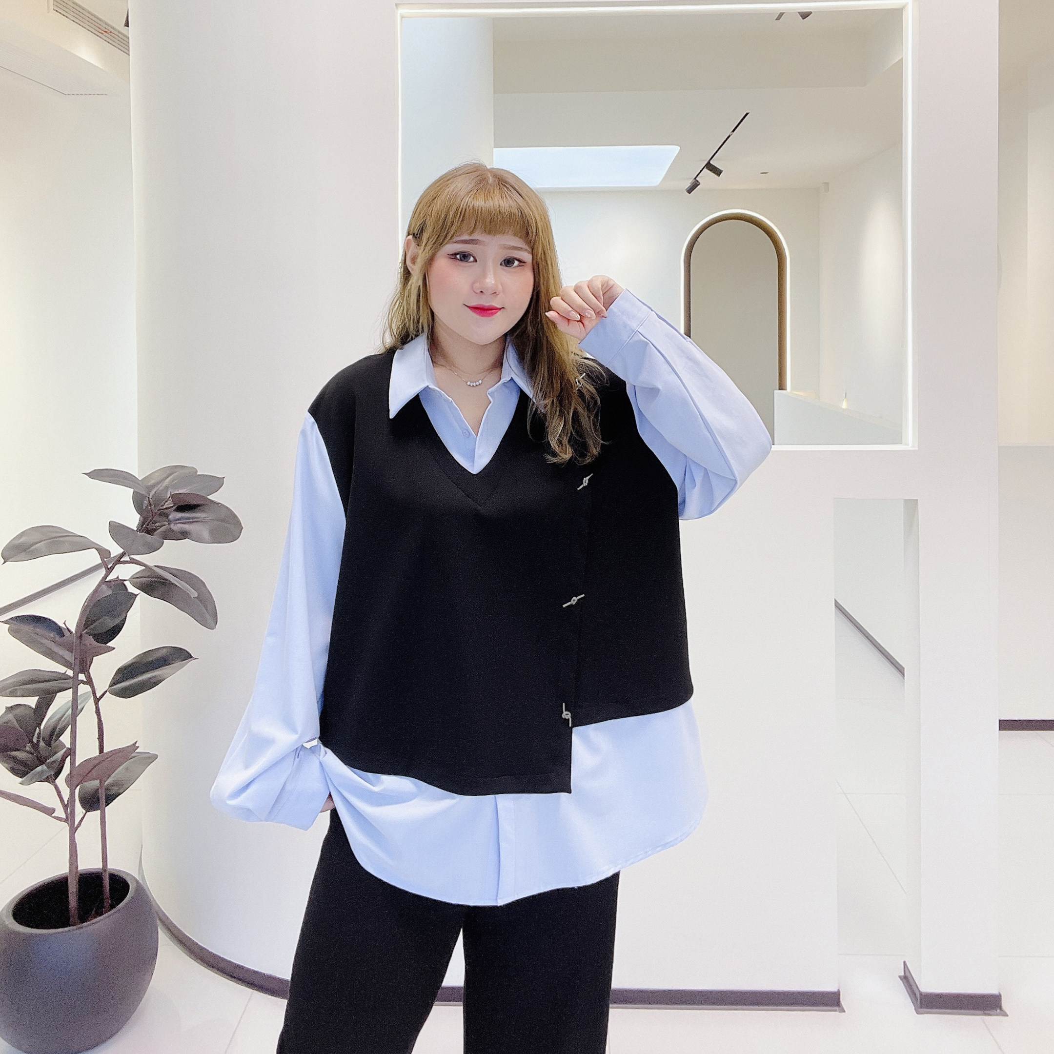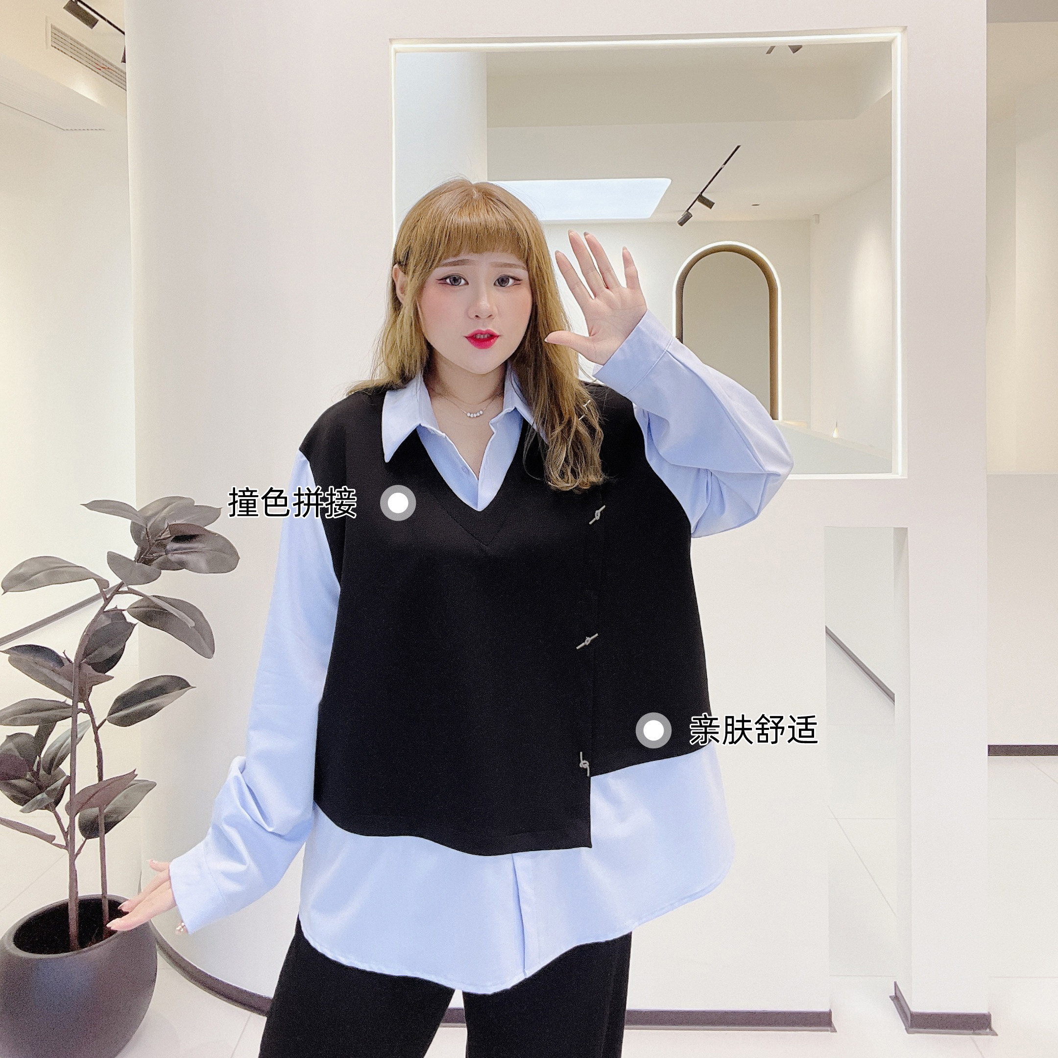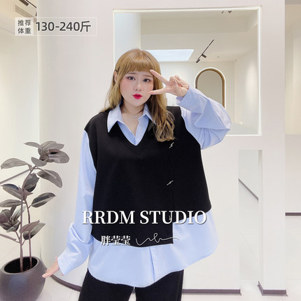 胖莹莹大码女装240斤胖mm高级感假两件马甲衬衫宽松遮肉显瘦上衣