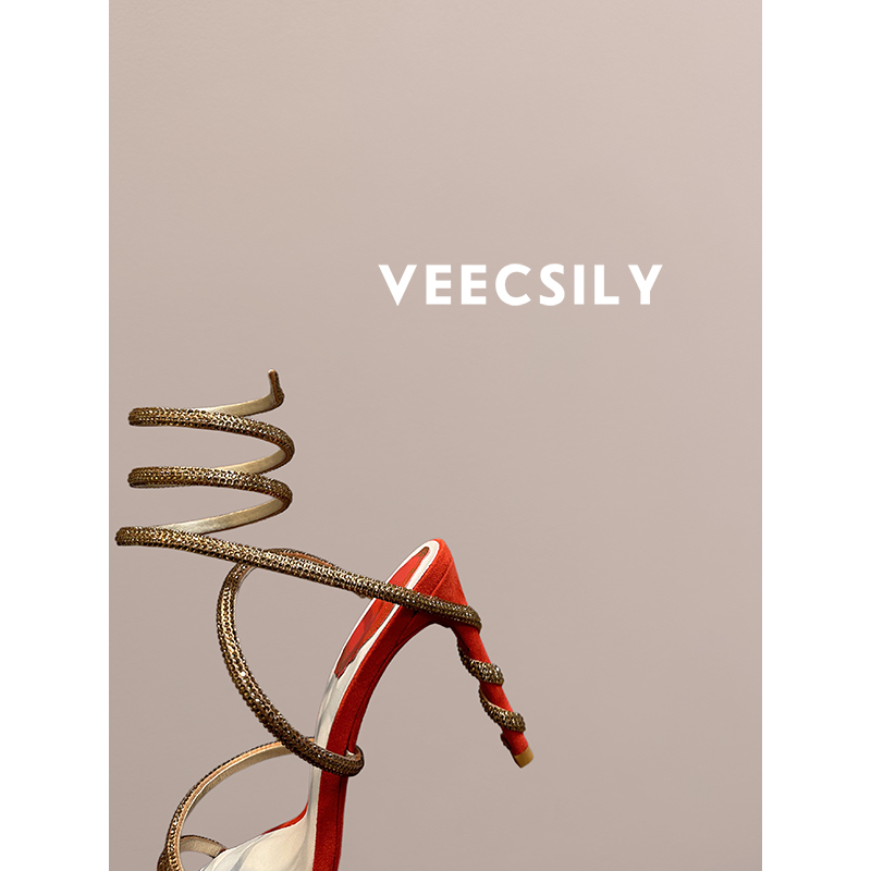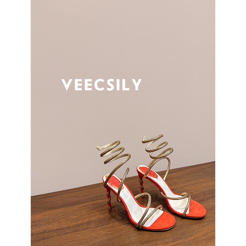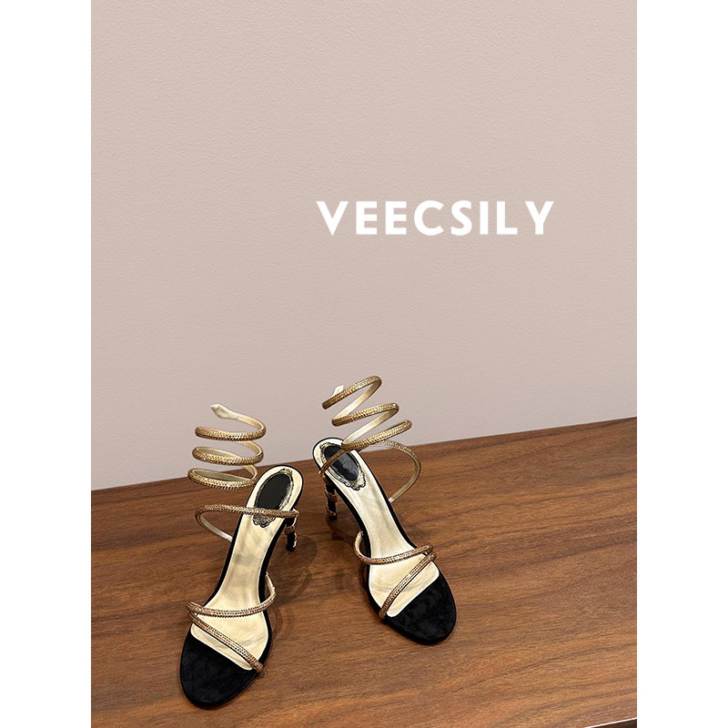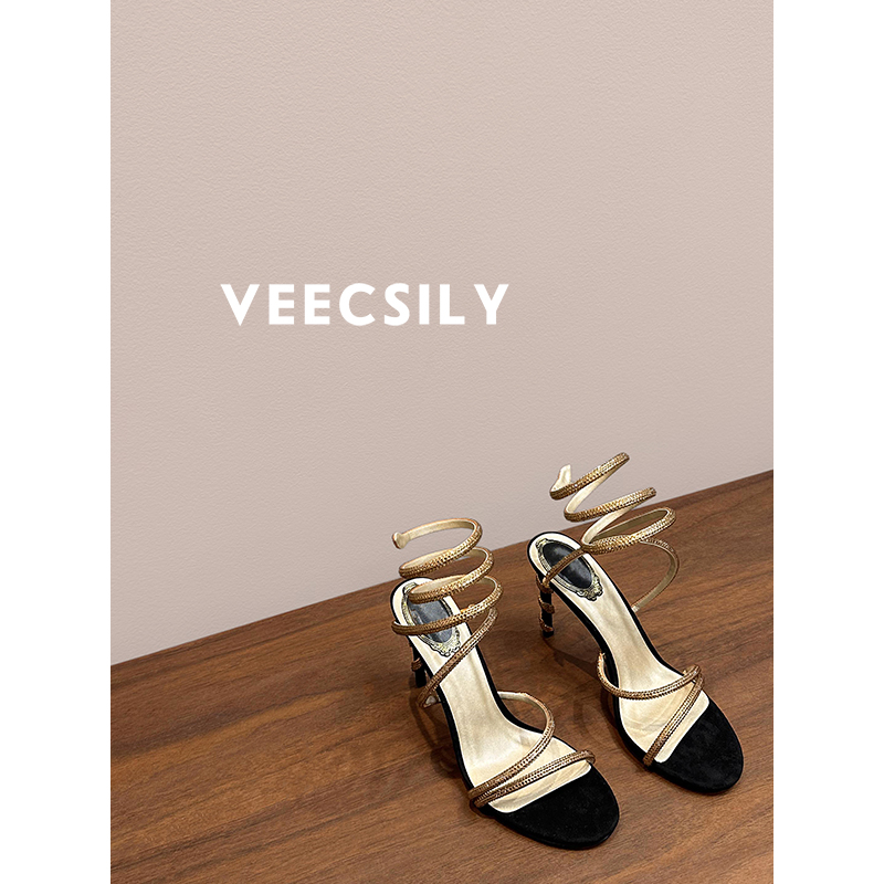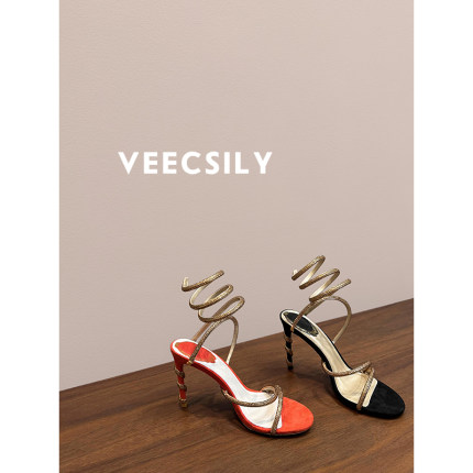 高定~水钻露趾蛇形缠绕一字带凉鞋女2025夏季新款宴会气质高跟鞋