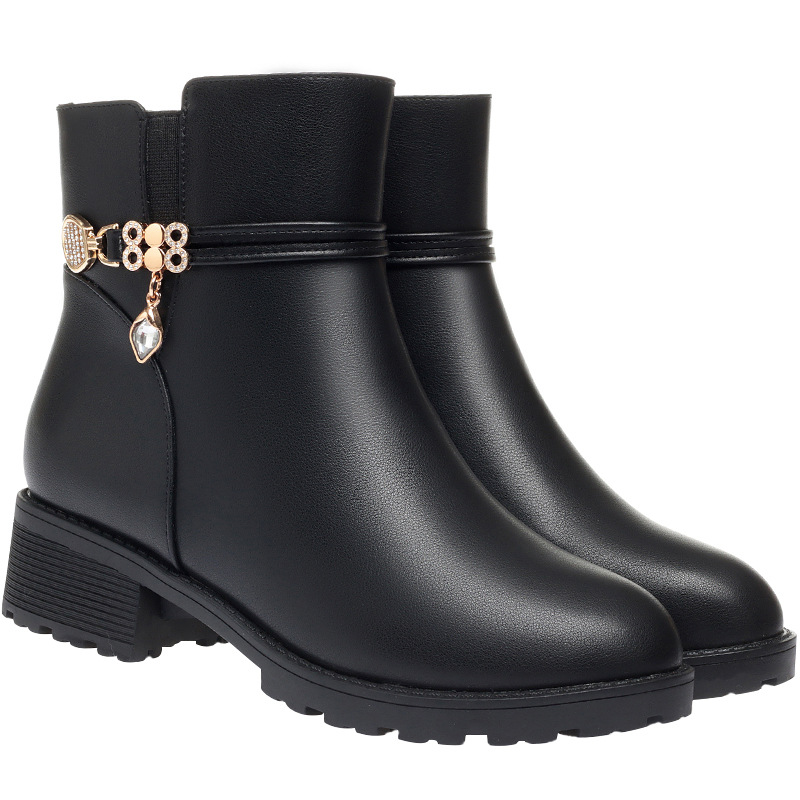 他她女孩粗跟短靴女加绒2025年秋冬季大棉皮鞋软皮妈妈棉鞋中老年