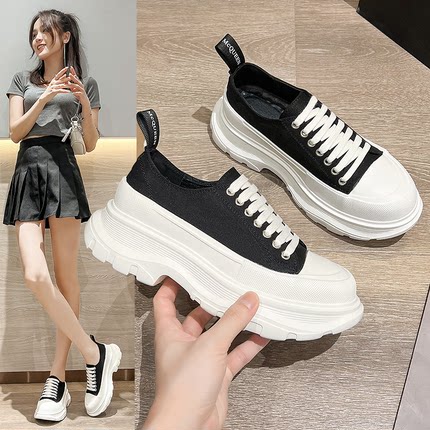 爆款帆布鞋女2025年秋季新款真皮增高老爹鞋休闲百搭厚底小白鞋子