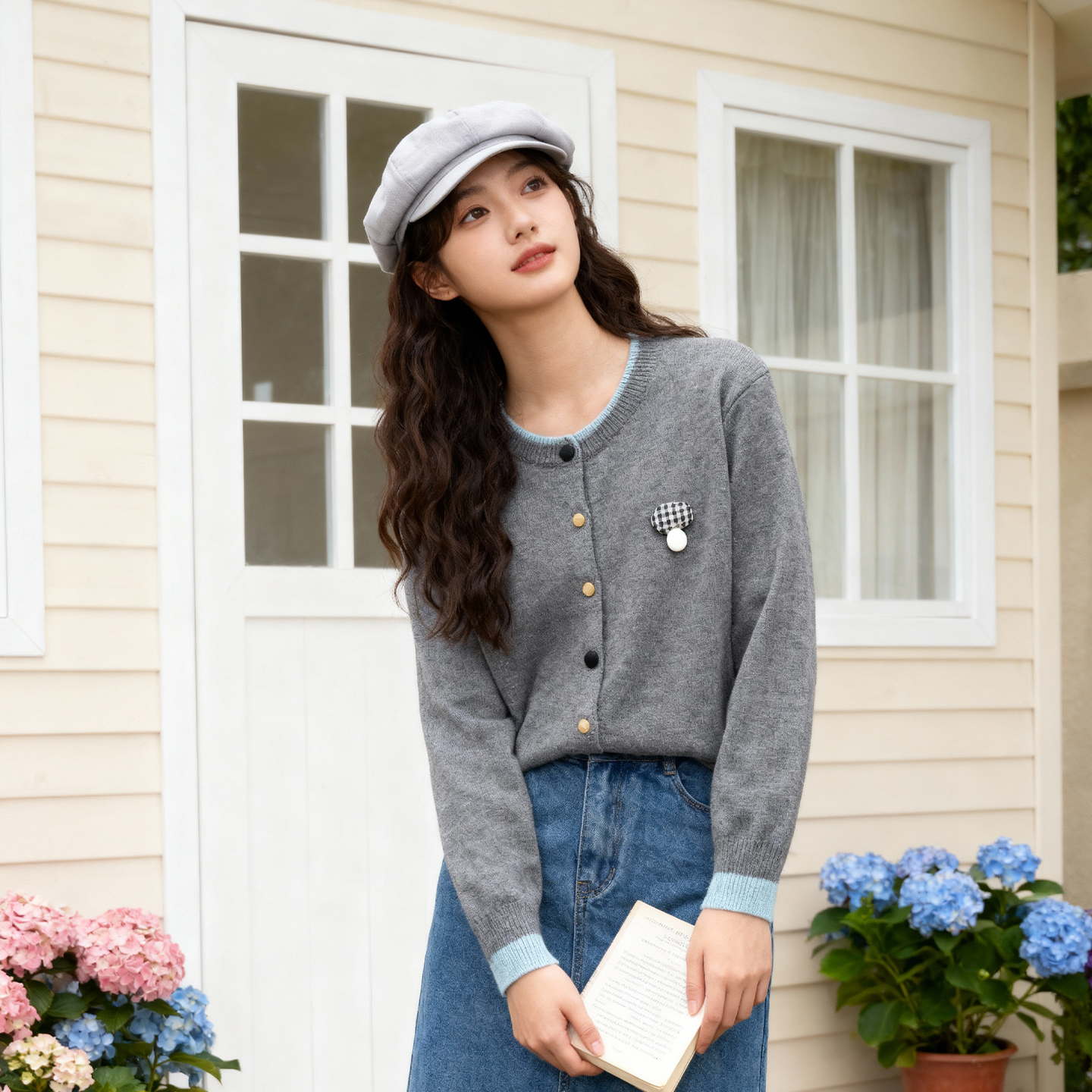 ROCOCO/洛可可2025学院风假两件开衫外套女秋季新款撞色圆领毛衣