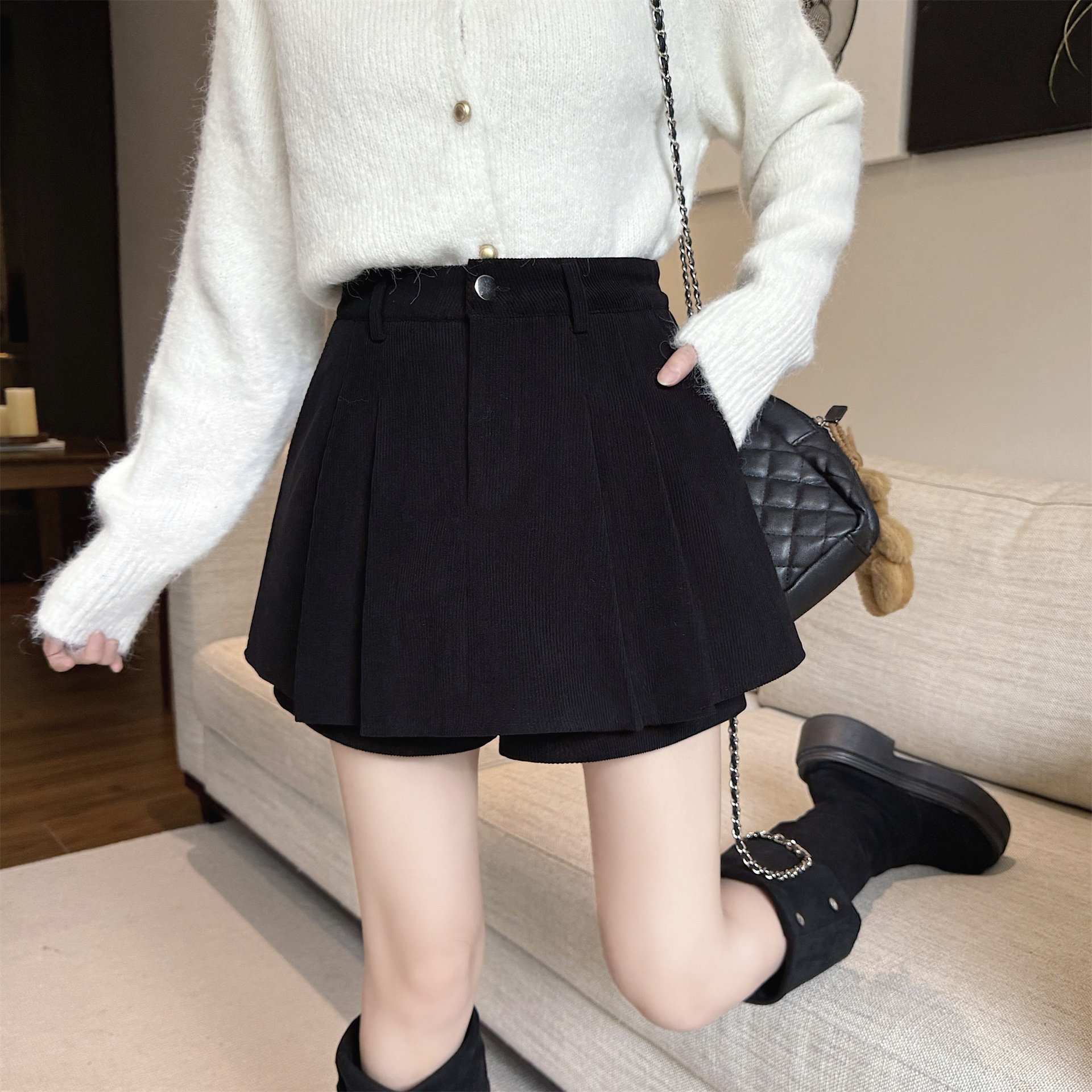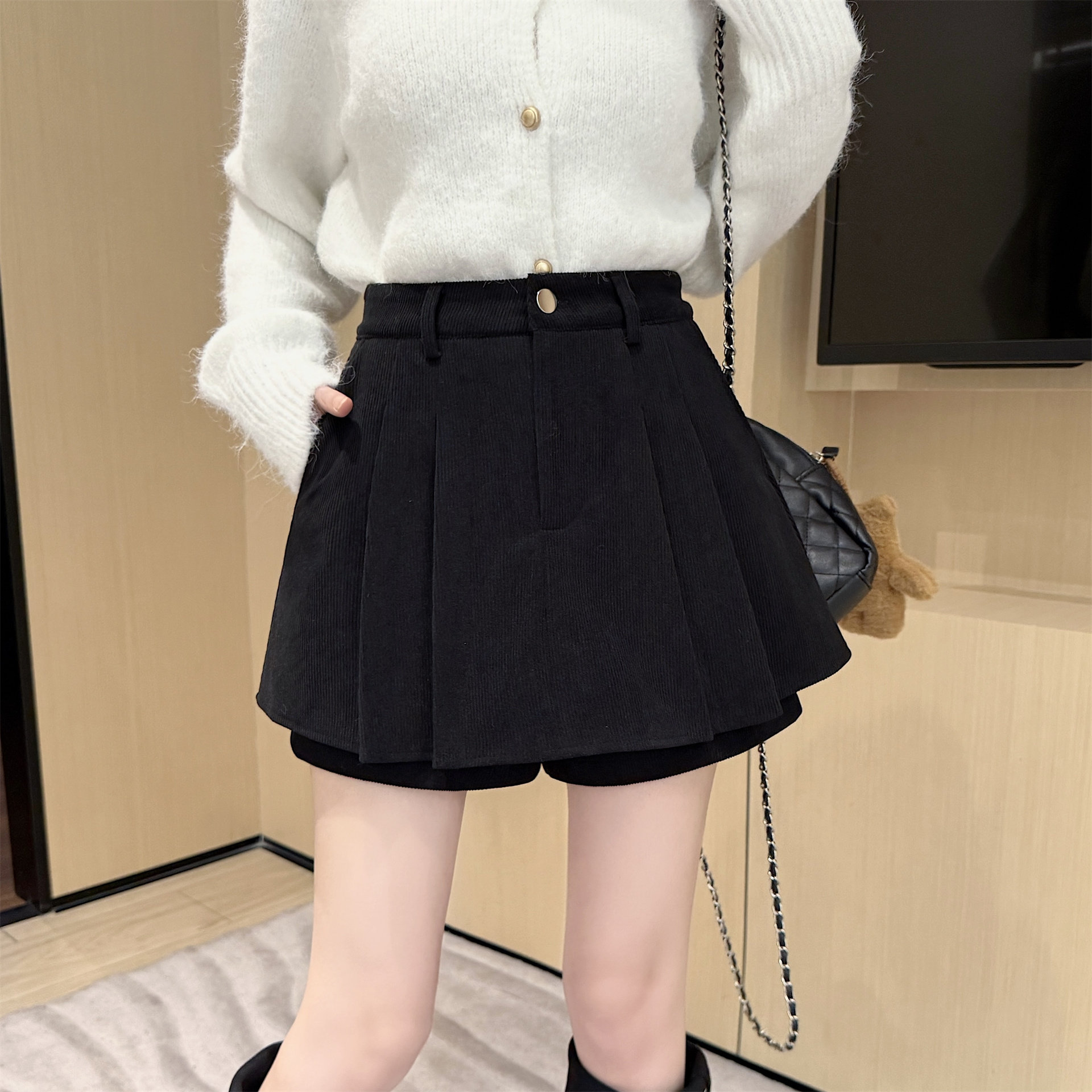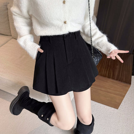 黑色灯芯绒半身裙女秋冬新款大码高腰显瘦百褶裤裙口袋A字裙短裙