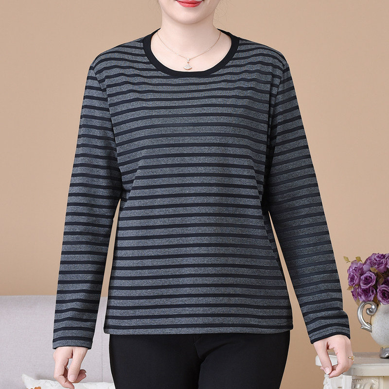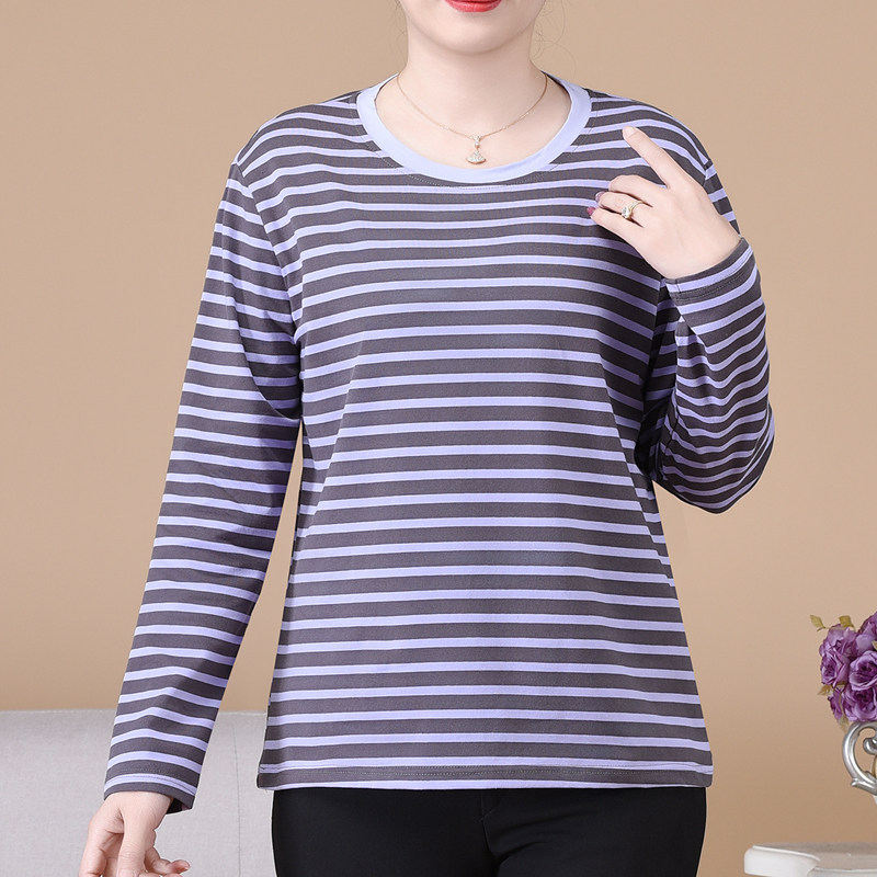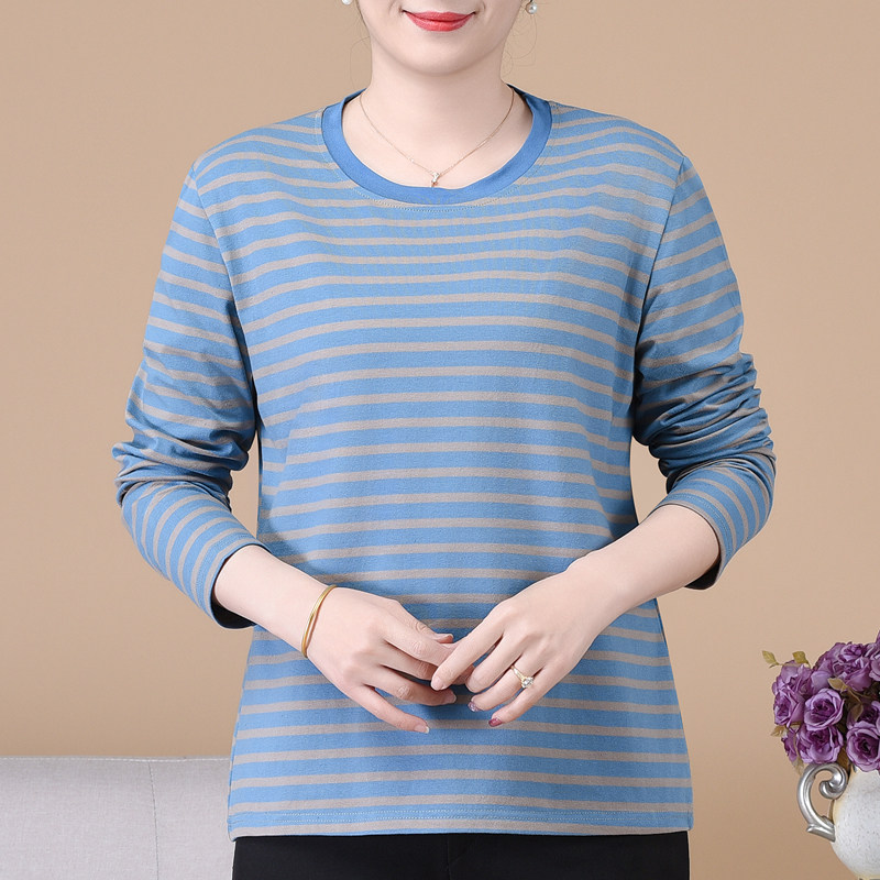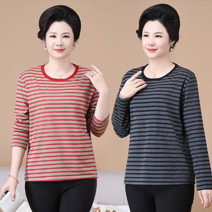 妈妈纯棉长袖t恤女中老年人春秋圆领条纹上衣大码宽松显瘦打底衫