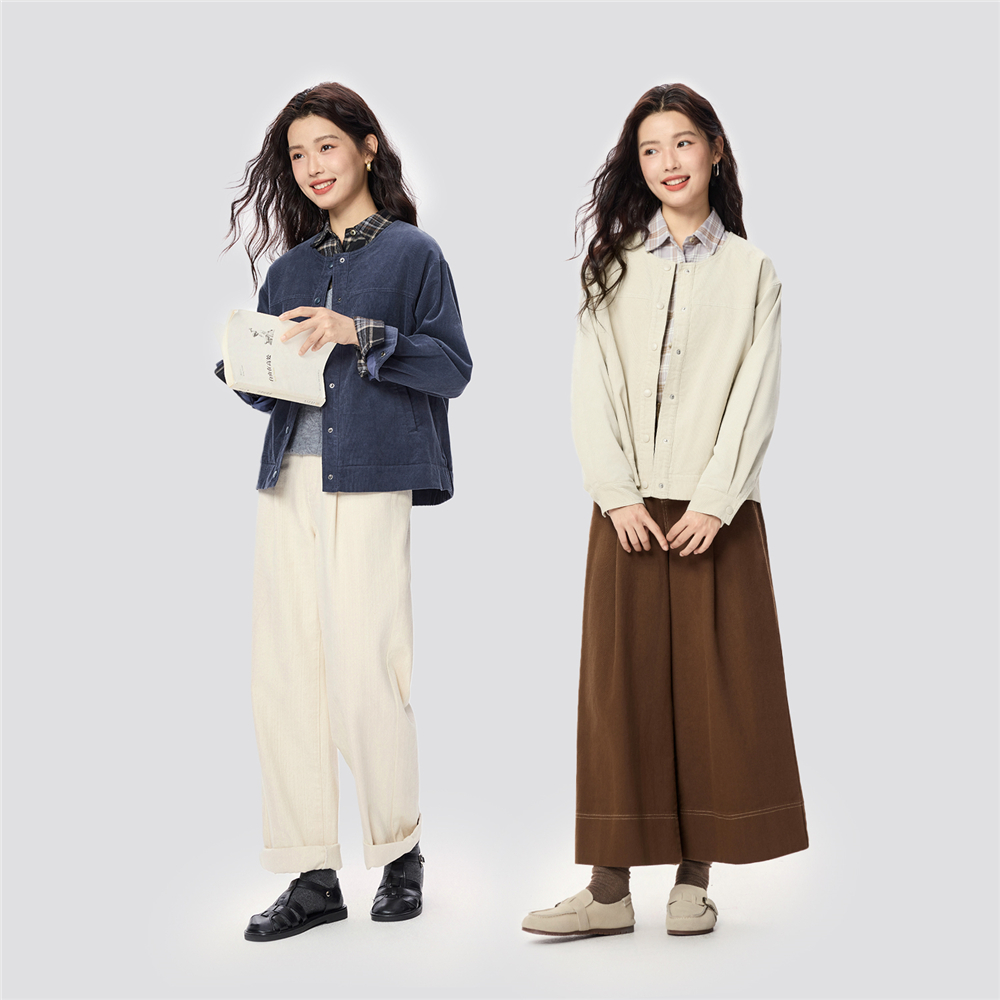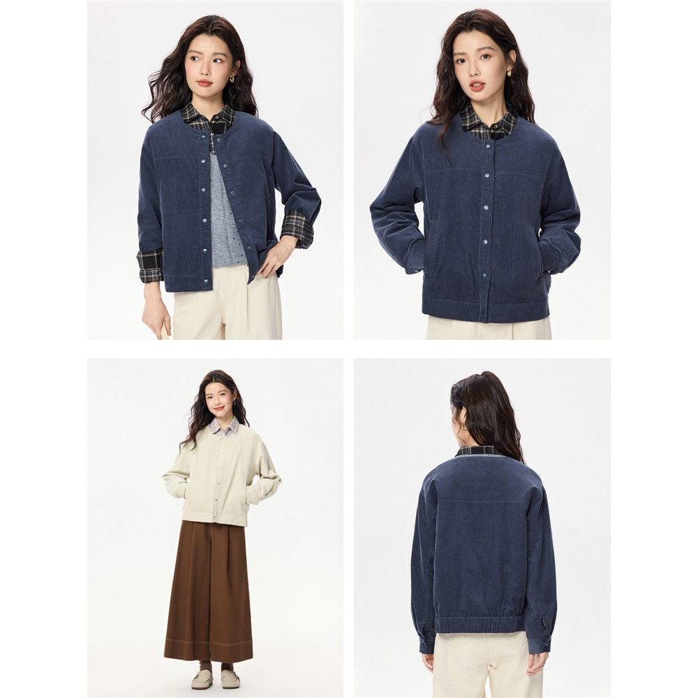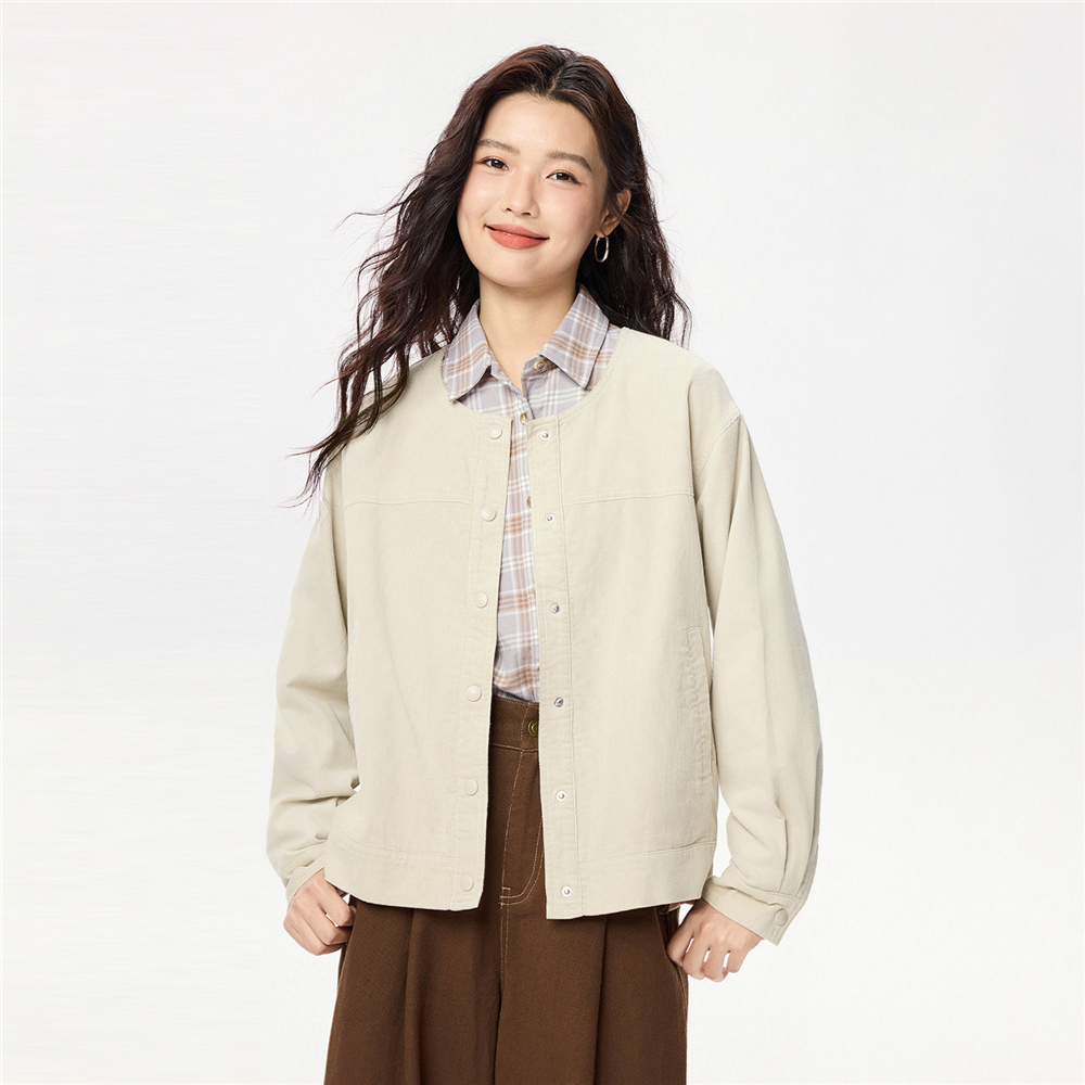 佐丹奴休闲外套女装秋冬新款纯棉灯芯绒破骨宽松圆领夹克13375659