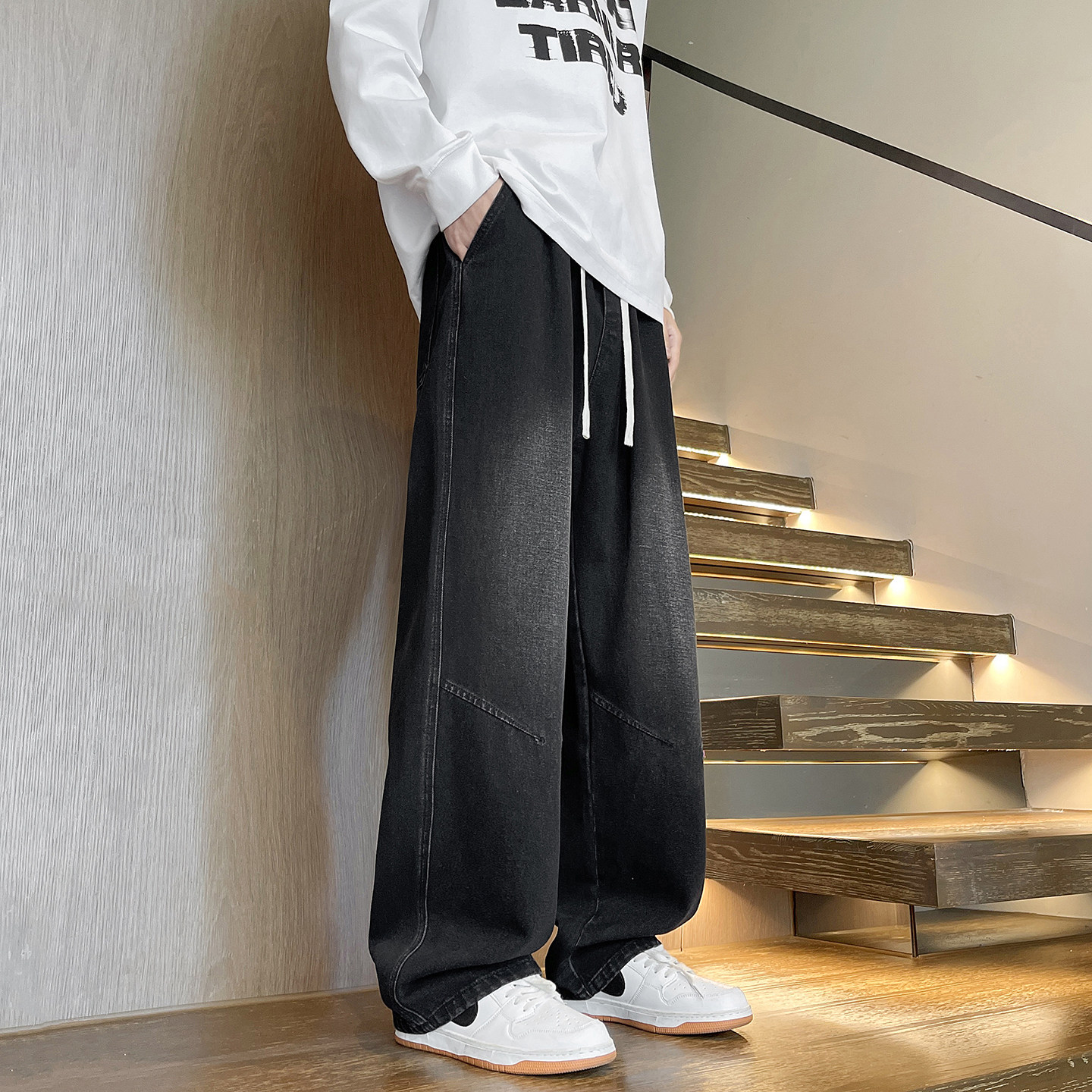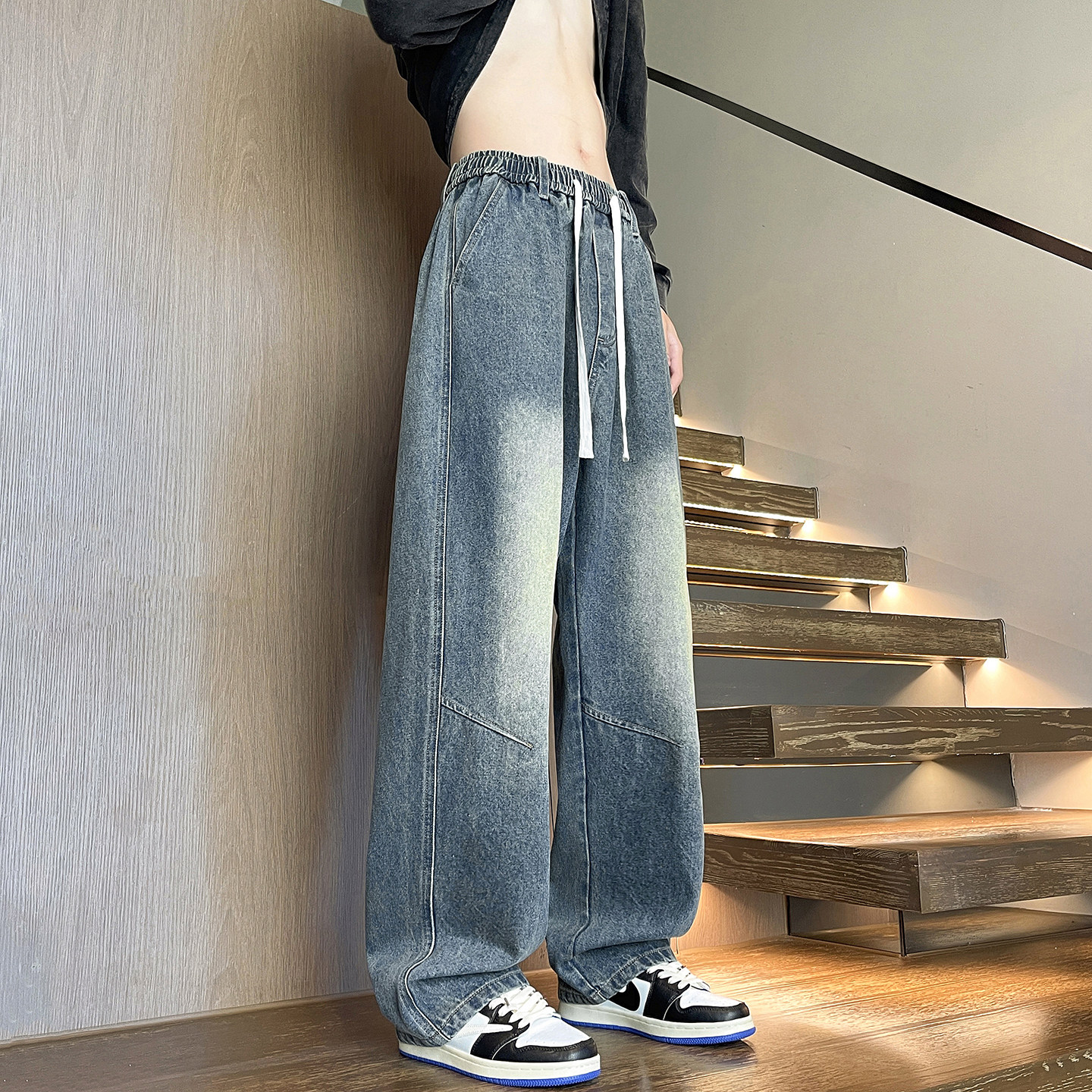 190高个子加长复古怀旧牛仔裤男阔腿裤加绒宽松直筒休闲裤青少年